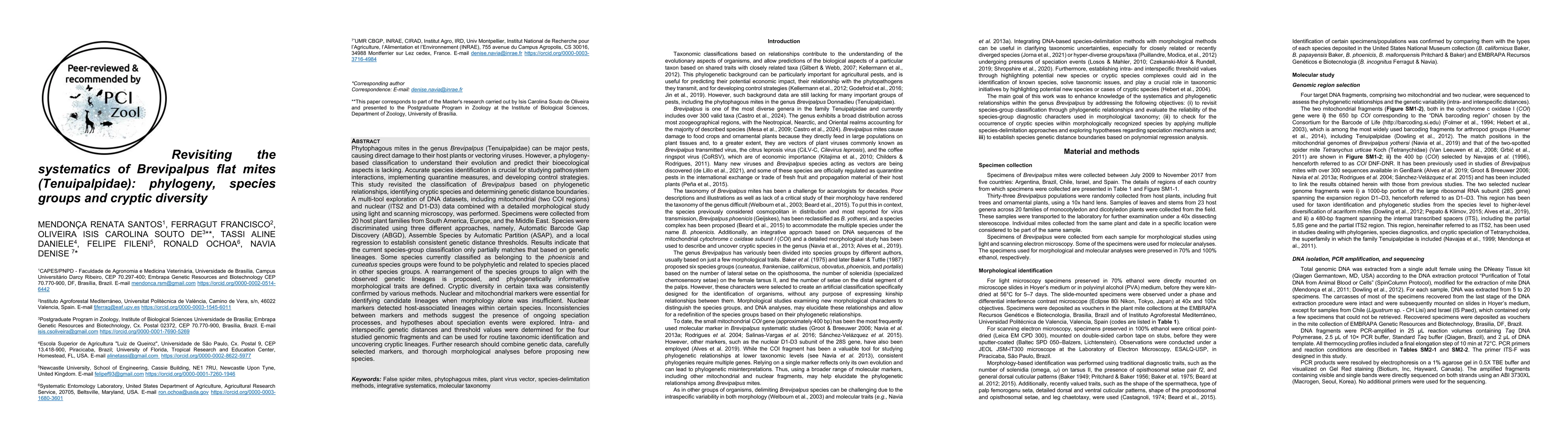 Phytophagous mites in the genus Brevipalpus (Tenuipalpidae) can be major pests, causing direct damage to their host plants or vectoring viruses. However, a phylogeny-based classification to understand their evolution and predict their bioecological aspects is lacking. Accurate species identification is crucial for studying pathosystem interactions, implementing quarantine measures, and developing control strategies. This study revisited the classification of Brevipalpus based on phylogenetic relationships, identifying cryptic species and determining genetic distance boundaries. A multi-tool exploration of DNA datasets, including mitochondrial (two COI regions) and nuclear (ITS2 and D1-D3) data combined with a detailed morphological study using light and scanning microscopy, was performed. Specimens were collected from 20 host plant families from South America, Europe, and the Middle East. Species were discriminated using three different approaches, namely, Automatic Barcode Gap Discovery (ABGD), Assemble Species by Automatic Partition (ASAP), and a local regression to establish consistent genetic distance thresholds. Results indicate that the current species-group classification only partially matches that based on genetic lineages. Some species currently classified as belonging to the phoenicis and cuneatus species groups were found to be polyphyletic and related to species placed in other species groups. A rearrangement of the species groups to align with the observed genetic lineages is proposed, and phylogenetically informative morphological traits are defined. Cryptic diversity in certain taxa was consistently confirmed by various methods. Nuclear and mitochondrial markers were essential for identifying candidate lineages when morphology alone was insufficient. Nuclear markers detected host-associated lineages within certain species. Inconsistencies between markers and methods suggest the presence of ongoing speciation processes, and hypotheses about speciation events were explored. Intra- and interspecific genetic distances and threshold values were determined for the four studied genomic fragments and can be used for routine taxonomic identification and uncovering cryptic lineages. Further research should combine genetic data, carefully selected markers, and thorough morphological analyses before proposing new species.