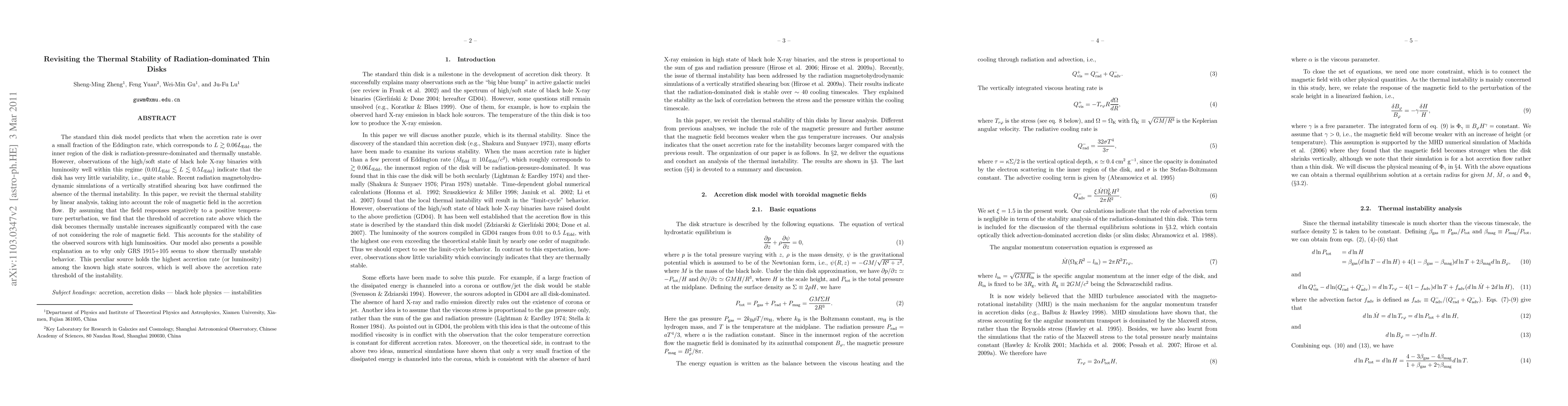 This paper revisits the thermal stability of radiation-dominated thin disks, finding that magnetic field effects significantly increase the threshold for thermal instability. The model explains the observed stability in most high luminosity sources and the exceptional instability in GRS 1915+105 due to its high accretion rate.
