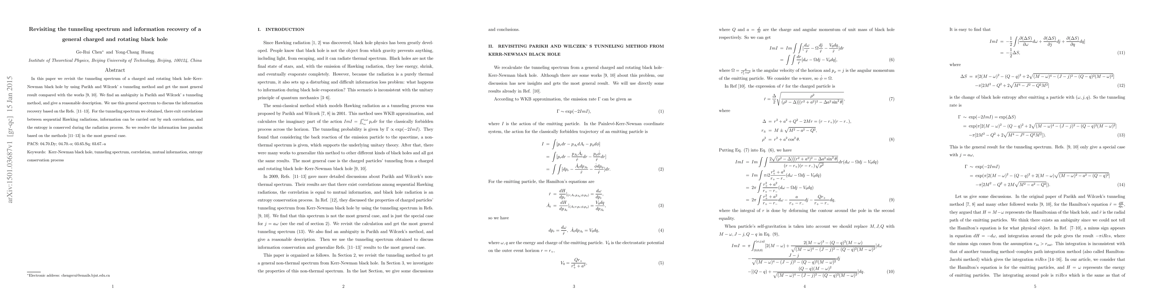 In this paper we revisit the tunneling spectrum of a charged and rotating black hole--Kerr-Newman black hole by using Parikh and Wilczek's tunneling method and get the most general result compared with the works [9, 10]. We find an ambiguity in Parikh and Wilczek's tunneling method, and give a reasonable description. We use this general spectrum to discuss the information recovery based on the Refs. [11-13]. For the tunneling spectrum we obtained, there exit correlations between sequential Hawking radiations, information can be carried out by such correlations, and the entropy is conserved during the radiation process. So we resolve the information loss paradox based on the methods [11-13] in the most general case.