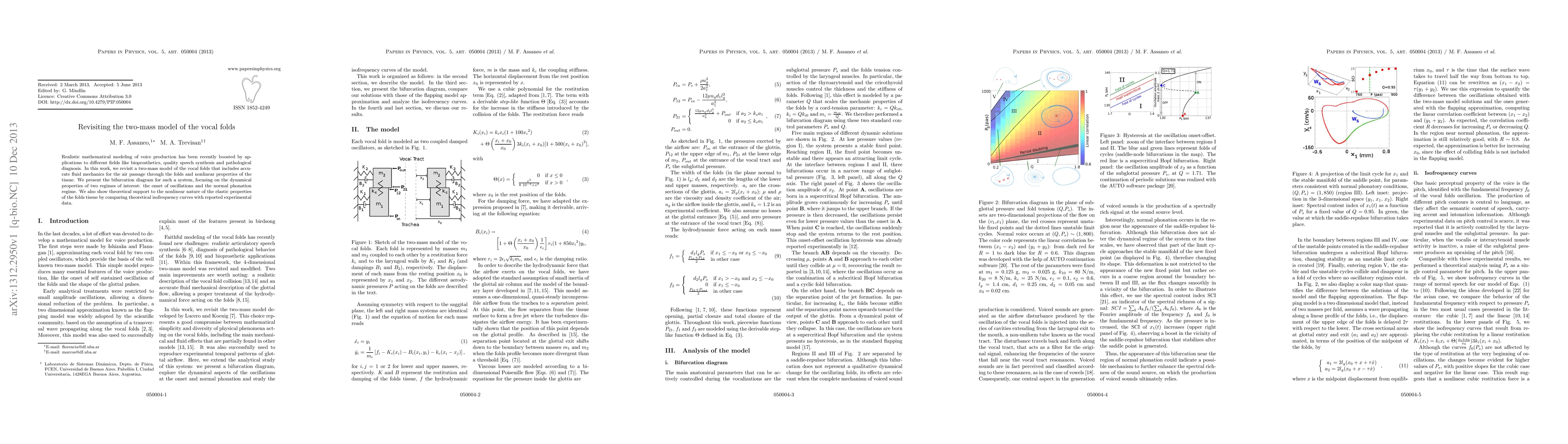 This paper revisits a two-mass model of vocal fold dynamics, incorporating precise fluid mechanics and nonlinear tissue properties. It explores the bifurcation diagram to analyze the onset of oscillations and normal phonation, and validates the model's nonlinear elastic properties by comparing theoretical isofrequency curves with experimental data.
