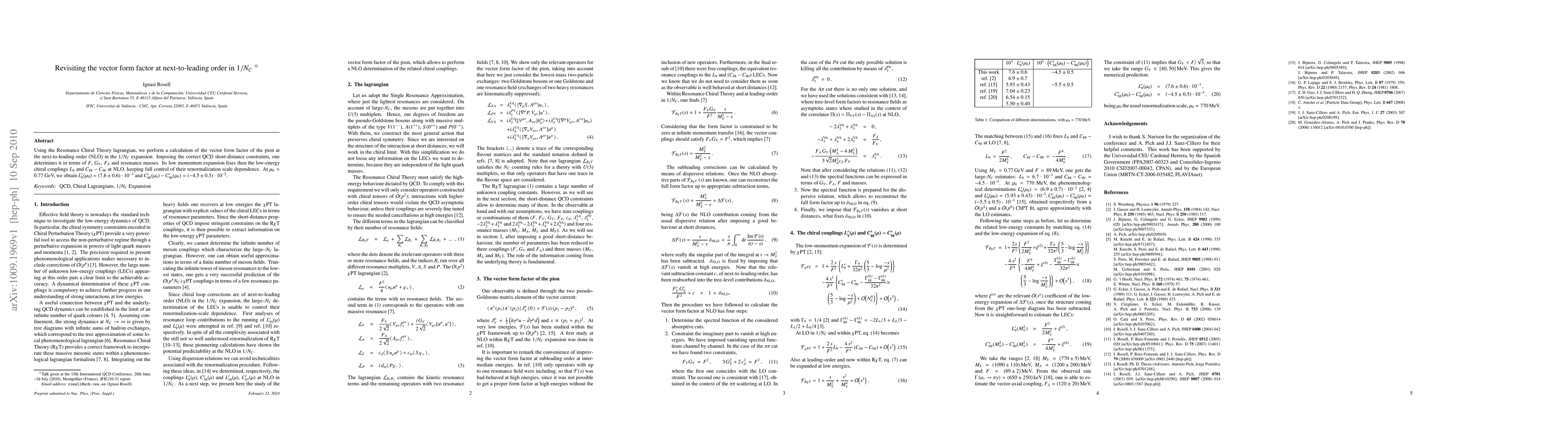 Using the Resonance Chiral Theory lagrangian, we perform a calculation of the vector form factor of the pion at the next-to-leading order (NLO) in the $1/N_C$ expansion. Imposing the correct QCD short-distance constraints, one determines it in terms of $F$, $G_V$, $F_A$ and resonance masses. Its low momentum expansion fixes then the low-energy chiral couplings $L_{9}$ and $C_{88}-C_{90}$ at NLO, keeping full control of their renormalization scale dependence. At $\mu_0=0.77$ GeV, we obtain $L_{9}^r(\mu_0) = (7.6 \pm 0.6)\cdot 10^{-3}$ and $C_{88}^r(\mu_0)-C_{90}^r(\mu_0)=(-4.5 \pm 0.5)\cdot 10^{-5}$.