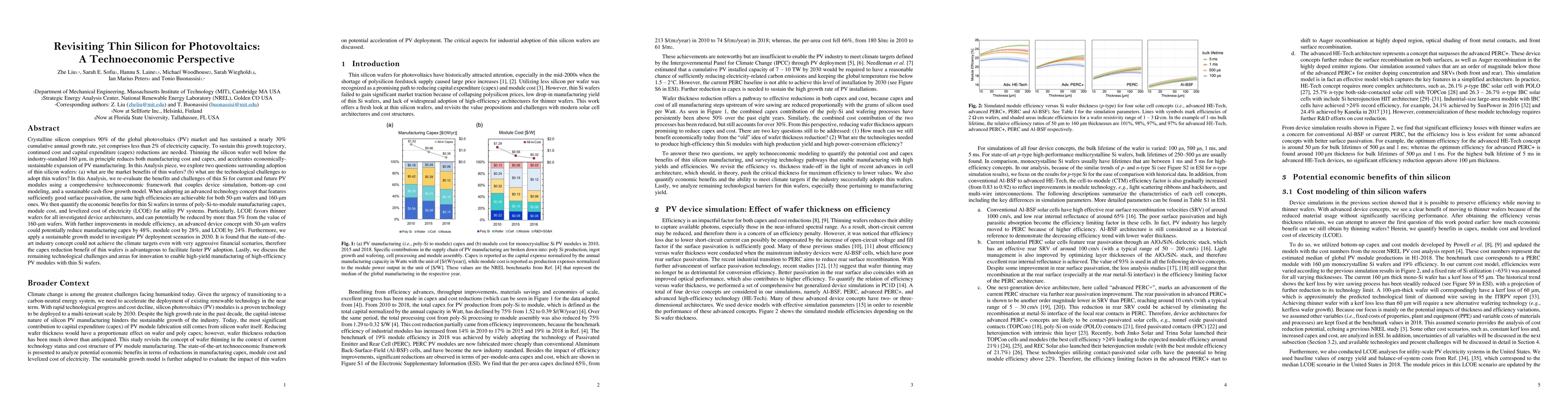 Adopting thin Si wafers for PV reduces capital expenditure (capex) and manufacturing cost, and accelerates the growth of PV manufacturing. There are two key questions about thin Si today: (a) how much can we still benefit economically from thinning wafers? (b) what are the technological challenges to transition to thin wafers? In this work, we re-evaluate the benefits and challenges of thin Si for current and future PV modules using a comprehensive techno-economic framework that couples device simulation, bottom-up cost modeling, and a cash-flow growth model. When adopting an advanced technology concept that features sufficiently good surface passivation, similarly high efficiencies are achievable for 50-um wafers as for 160-um ones. We then quantify the economic benefits for thin Si wafers in terms of poly-Si-to-module manufacturing capex, module cost, and levelized cost of electricity (LCOE) for utility PV systems. Particularly, LCOE favors thinner wafers for all investigated device architectures, and can potentially be reduced by more than 5% from the value of 160-um wafers. With further improvements in module efficiency, an advanced thin-wafer device concept with 50-um wafers could reduce manufacturing capex by 48%, module cost by 28%, and LCOE by 24%. Furthermore, we apply a sustainable growth model to investigate PV deployment scenarios in 2030. It is found that the state-of-the-art industry concept could not achieve the climate targets even with very aggressive financial scenarios, therefore the capex reduction benefit of thin wafers is needed to facilitate more rapid PV growth. Lastly, we discuss the remaining technological challenges and areas for innovation to enable high-yield manufacturing of high-efficiency PV modules with thin Si wafers.