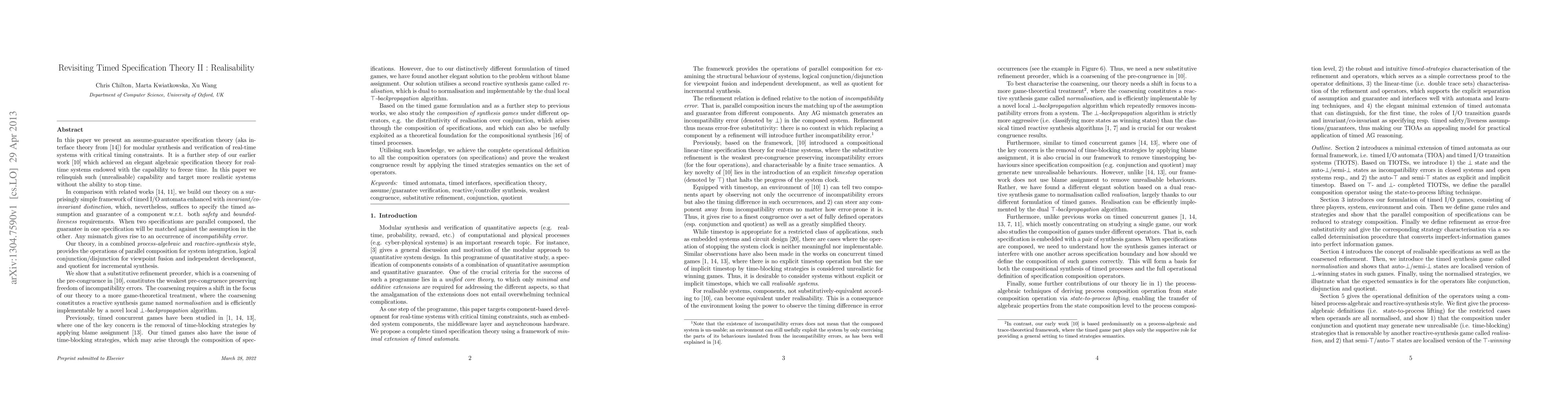 This paper advances an assume-guarantee specification theory for real-time systems, focusing on realistic scenarios without time-freezing. It introduces operations for system integration and synthesis, and proposes a novel game-theoretical approach to address time-blocking strategies through a dual reactive synthesis game called realisation.