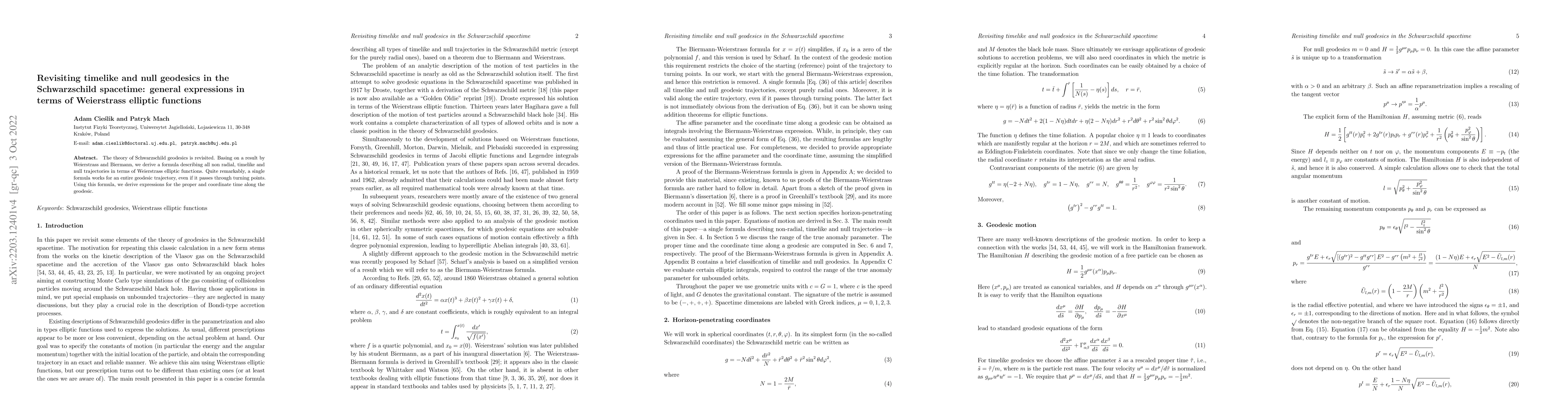 This paper revisits Schwarzschild geodesics, deriving general expressions for non-radial timelike and null trajectories using Weierstrass elliptic functions. A single formula describes the entire geodesic, including turning points, and provides expressions for proper and coordinate time.