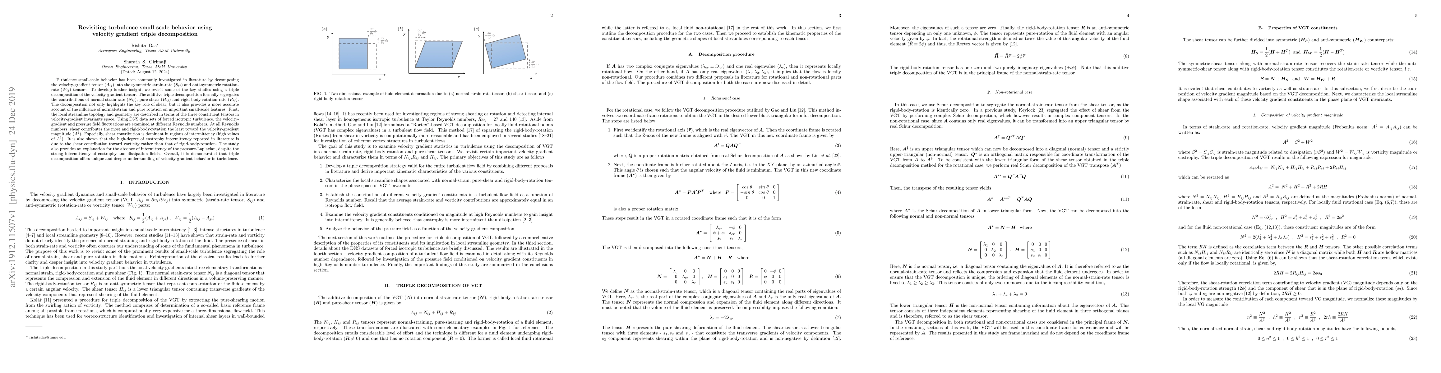 This paper revisits turbulence small-scale behavior using a triple decomposition of the velocity-gradient tensor, highlighting the dominant role of shear and the lesser influence of normal-strain and rigid-body-rotation. The study reveals that shear is crucial in regions of high velocity-gradient magnitude, explaining the intermittency of enstrophy and the absence of intermittency in pressure-Laplacian fluctuations.