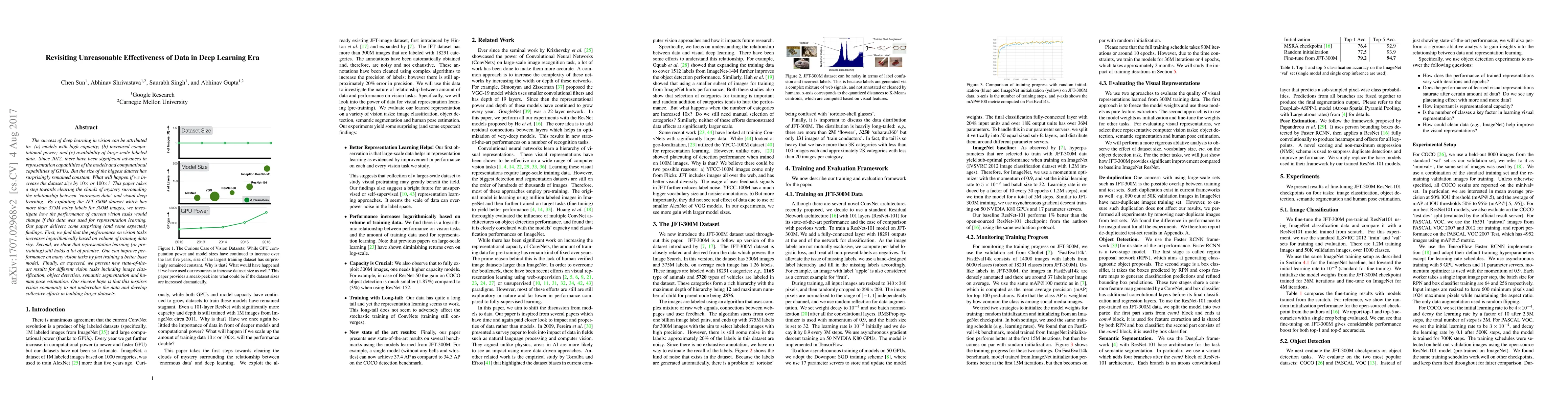 This paper investigates how increasing dataset size affects deep learning performance, finding that larger datasets lead to logarithmic increases in performance and new state-of-the-art results for various vision tasks.