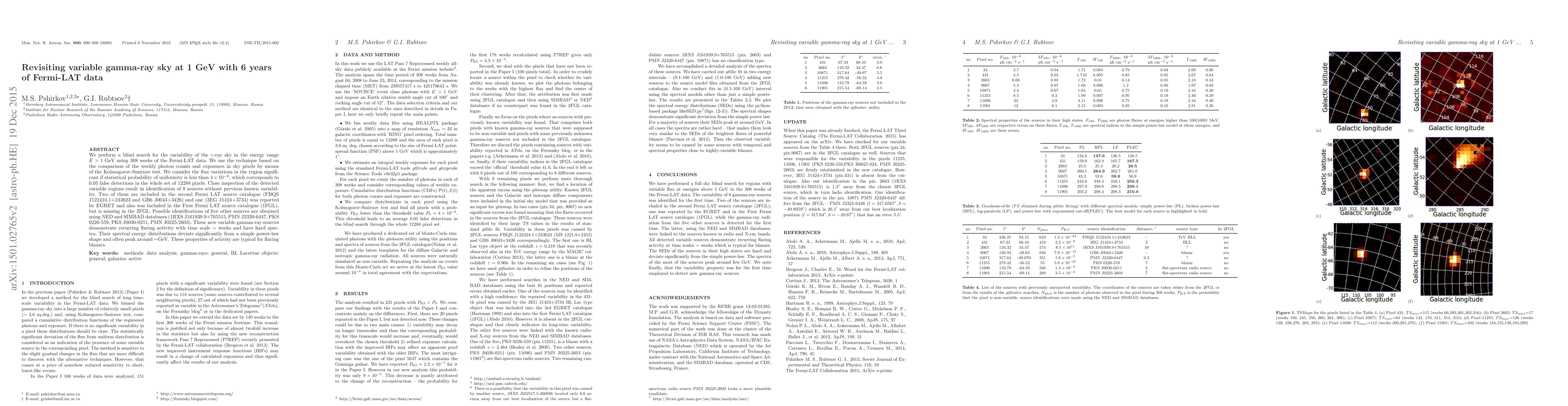 We perform a blind search for the variability of the gamma-ray sky in the energy range E>1 GeV using 308 weeks of the Fermi-LAT data. We use the technique based on the comparison of the weekly photon counts and exposures in sky pixels by means of the Kolmogorov-Smirnov test. We consider the flux variations in the region significant if statistical probability of uniformity is less than $4\times10^{-6}$, which corresponds to 0.05 false detections in the whole set of 12288 pixels. Close inspection of the detected variable regions result in identification of 8 sources without previous known variability. Two of them are included in the second Fermi LAT source catalogue (FBQS J122424.1+243623 and GB6 J0043+3426) and one (3EG J1424+3734) was reported by EGRET and also was included in the First Fermi LAT source catalogue (1FGL), but is missing in the 2FGL. Possible identifications of five other sources are obtained using NED and SIMBAD databases (1RXS J161939.9+765515, PMN J2320-6447, PKS 0226-559, PKS J0030-0211, PMN J0225-2603). These new variable gamma-ray sources demonstrate recurring flaring activity with time scale ~weeks and have hard spectra. Their spectral energy distributions deviate significantly from a simple power-law shape and often peak around ~GeV. These properties of activity are typical for flaring blazars.