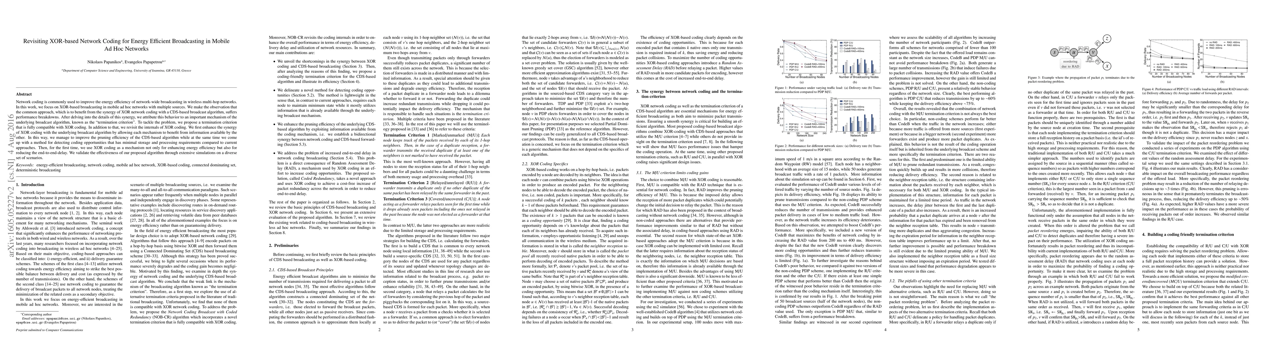 This paper revisits XOR-based network coding for energy-efficient broadcasting in mobile ad hoc networks, proposing a new termination criterion that enhances synergy with CDS-based algorithms, reduces storage and processing needs, and minimizes end-to-end delay. The effectiveness of the proposed method is validated through extensive simulations.