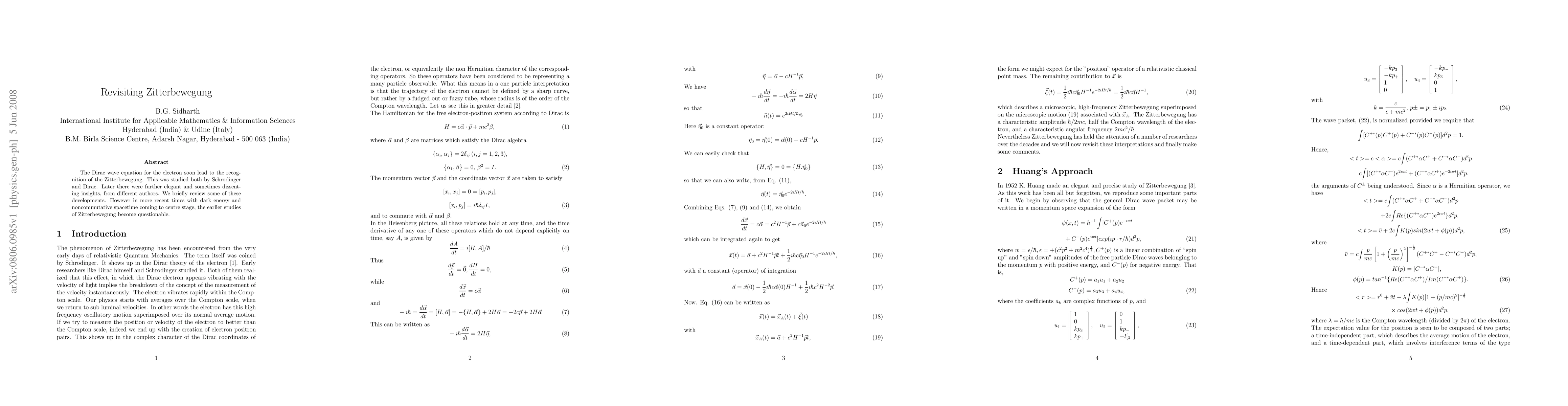 This paper revisits the concept of Zitterbewegung, an oscillatory phenomenon in the electron's wave function arising from the Dirac equation, and discusses its historical interpretations and recent reconsiderations in the context of dark energy and noncommutative spacetime.