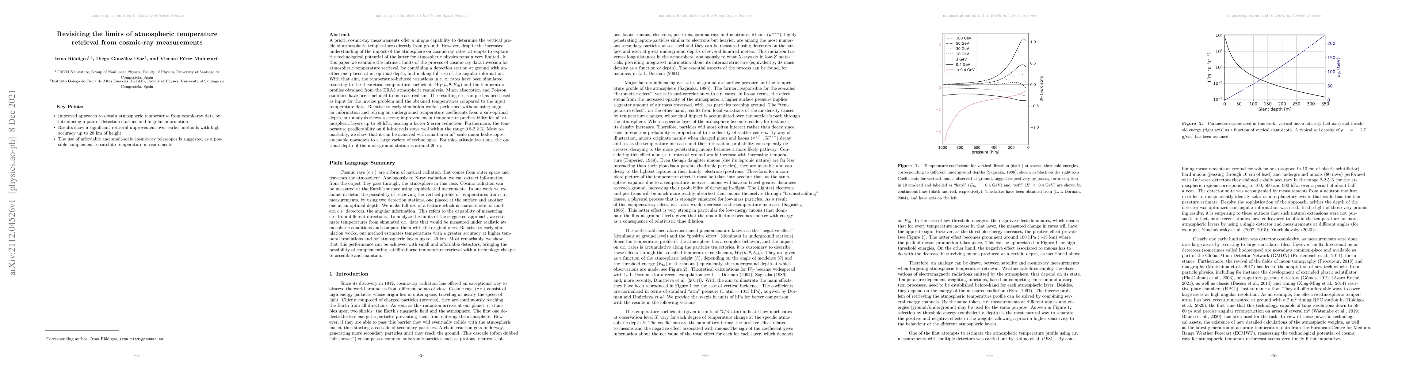 The paper presents an advanced method for atmospheric temperature retrieval using cosmic-ray measurements, incorporating angular information and optimizing underground detector depth for improved accuracy.