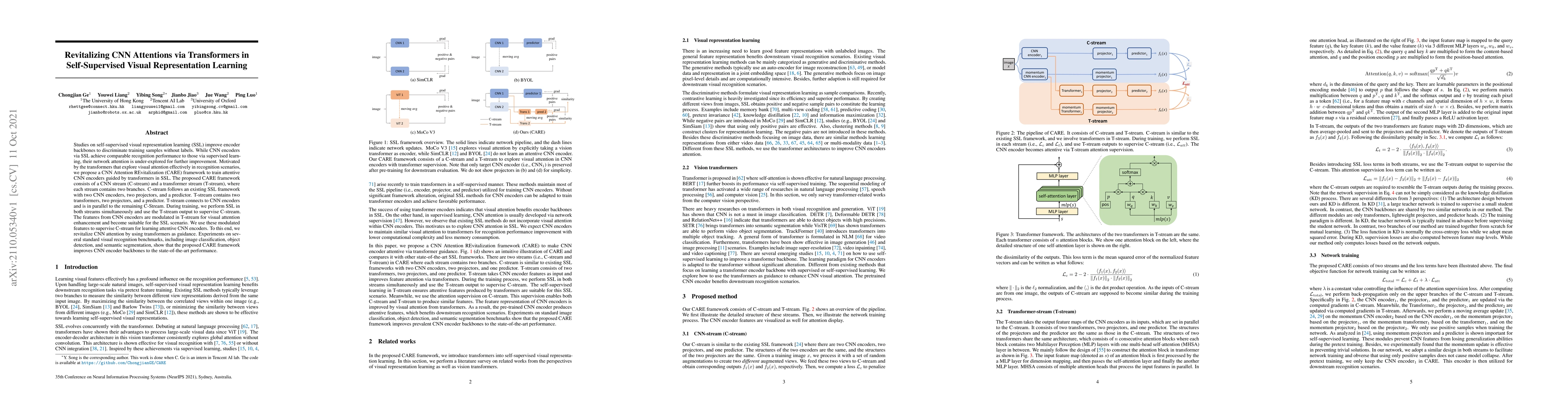 The paper proposes a CARE framework to revitalize CNN attentions using transformers in self-supervised visual representation learning. The framework integrates CNN and transformer streams to enhance CNN encoders' attention, achieving state-of-the-art performance on various visual recognition tasks.