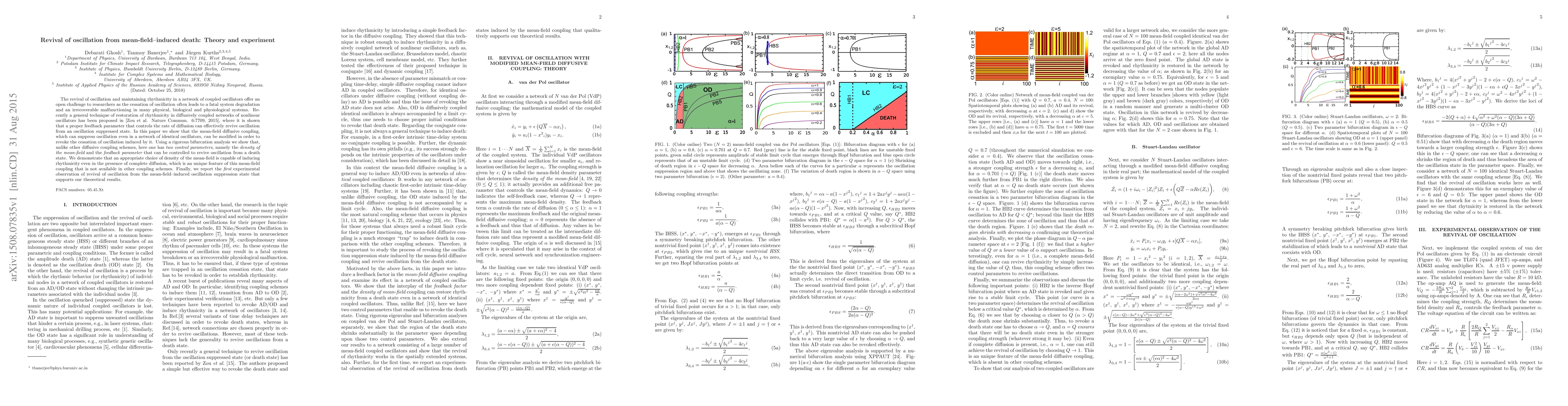 This paper presents a theoretical and experimental study on reviving oscillations in coupled oscillator networks from mean-field-induced death, demonstrating that two control parameters—mean-field density and feedback rate—can restore rhythmicity. Experimental results support the theoretical findings, showcasing the unique capability of mean-field coupling to induce oscillations even under complete diffusion.