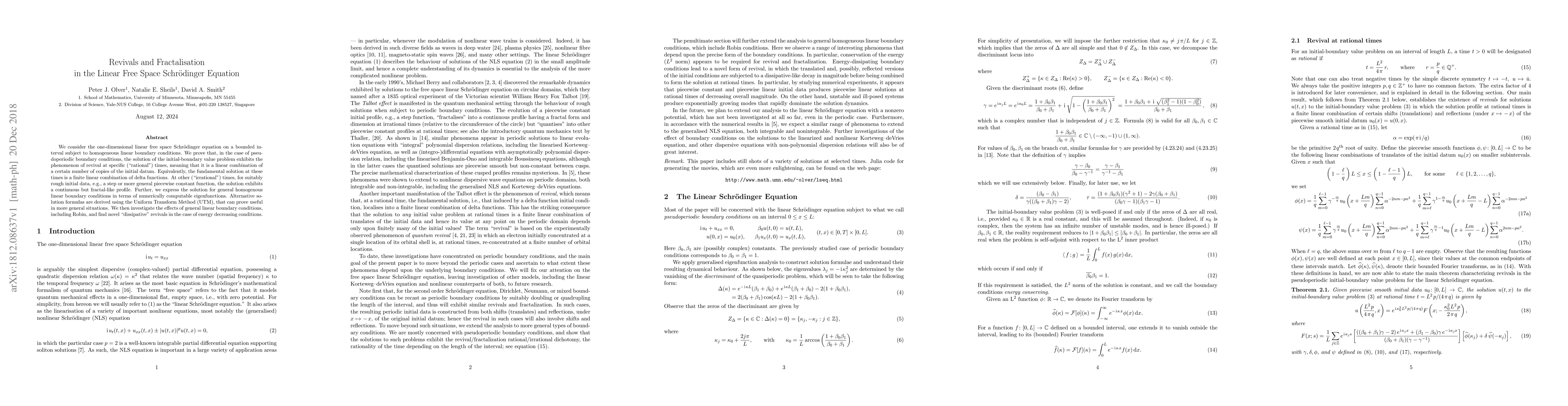 We consider the one-dimensional linear free space Schr\"odinger equation on a bounded interval subject to homogeneous linear boundary conditions. We prove that, in the case of pseudoperiodic boundary conditions, the solution of the initial-boundary value problem exhibits the phenomenon of revival at specific (`rational') times, meaning that it is a linear combination of a certain number of copies of the initial datum. Equivalently, the fundamental solution at these times is a finite linear combination of delta functions. At other (`irrational') times, for suitably rough initial data, e.g., a step or more general piecewise constant function, the solution exhibits a continuous but fractal-like profile. Further, we express the solution for general homogenous linear boundary conditions in terms of numerically computable eigenfunctions. Alternative solution formulas are derived using the Uniform Transform Method (UTM), that can prove useful in more general situations. We then investigate the effects of general linear boundary conditions, including Robin, and find novel `dissipative' revivals in the case of energy decreasing conditions.