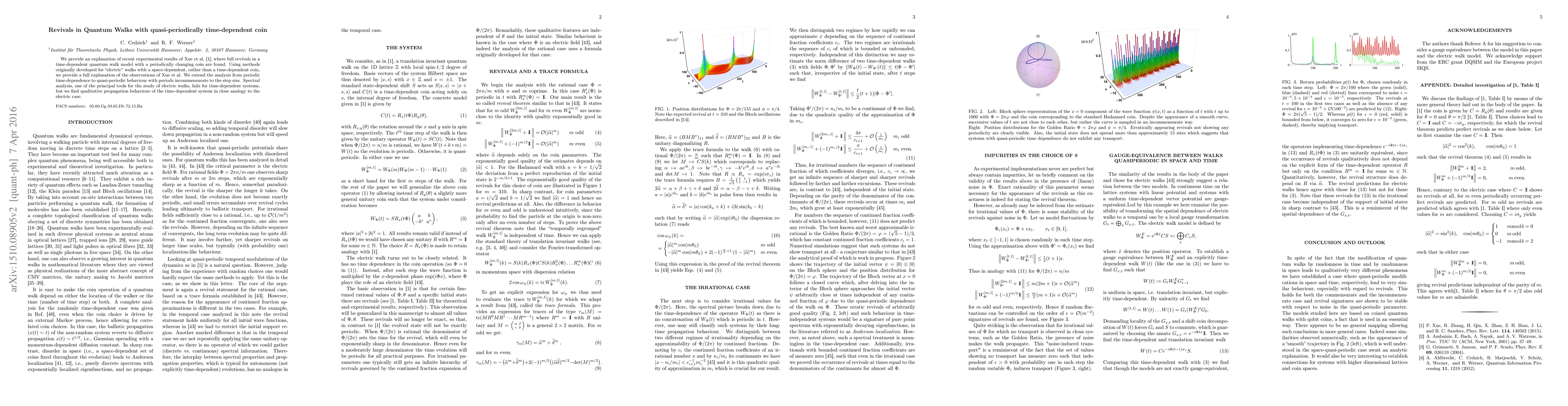 We provide an explanation of recent experimental results of Xue et al., where full revivals in a time-dependent quantum walk model with a periodically changing coin are found. Using methods originally developed for "electric" walks with a space-dependent, rather than a time-dependent coin, we provide a full explanation of the observations of Xue et al. We extend the analysis from periodic time-dependence to quasi-periodic behaviour with periods incommensurate to the step size. Spectral analysis, one of the principal tools for the study of electric walks, fails for time-dependent systems, but we find qualitative propagation behaviour of the time-dependent system in close analogy to the electric case.