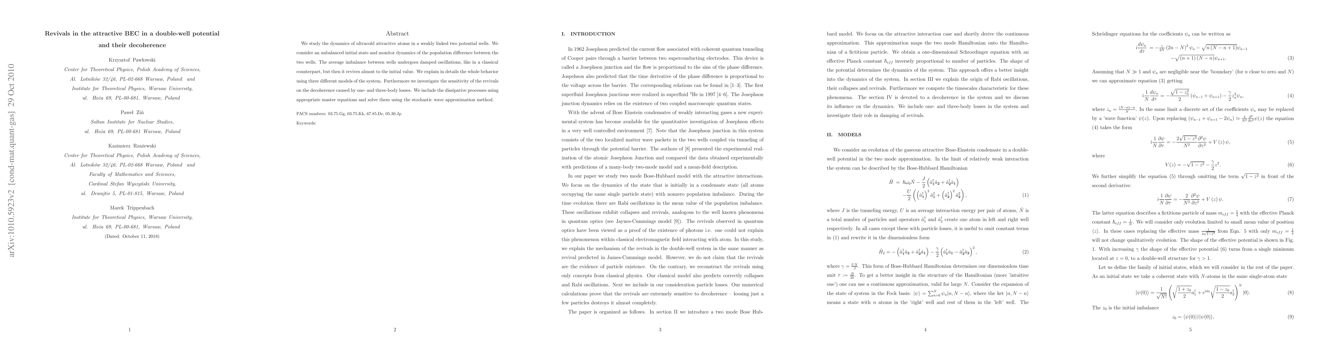 The paper presents detailed analysis using three models to explain the dynamics of attractive BECs in double-well potentials and investigates the effect of one- and three-body losses on revivals using master equations and stochastic wave approximation method.