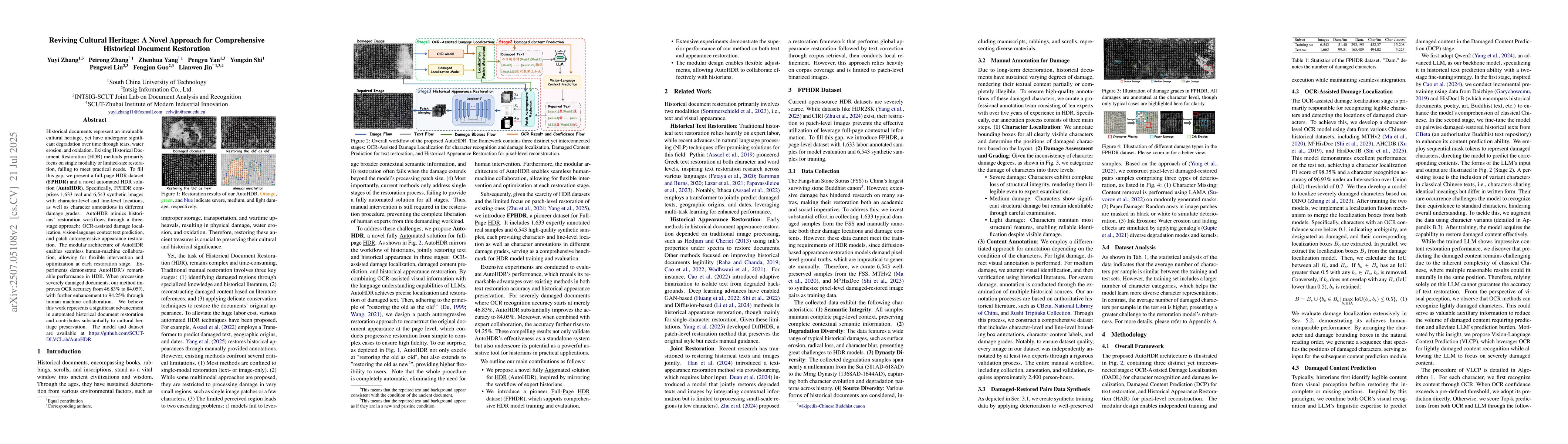 Historical documents represent an invaluable cultural heritage, yet have undergone significant degradation over time through tears, water erosion, and oxidation. Existing Historical Document Restoration (HDR) methods primarily focus on single modality or limited-size restoration, failing to meet practical needs. To fill this gap, we present a full-page HDR dataset (FPHDR) and a novel automated HDR solution (AutoHDR). Specifically, FPHDR comprises 1,633 real and 6,543 synthetic images with character-level and line-level locations, as well as character annotations in different damage grades. AutoHDR mimics historians' restoration workflows through a three-stage approach: OCR-assisted damage localization, vision-language context text prediction, and patch autoregressive appearance restoration. The modular architecture of AutoHDR enables seamless human-machine collaboration, allowing for flexible intervention and optimization at each restoration stage. Experiments demonstrate AutoHDR's remarkable performance in HDR. When processing severely damaged documents, our method improves OCR accuracy from 46.83\% to 84.05\%, with further enhancement to 94.25\% through human-machine collaboration. We believe this work represents a significant advancement in automated historical document restoration and contributes substantially to cultural heritage preservation. The model and dataset are available at https://github.com/SCUT-DLVCLab/AutoHDR.