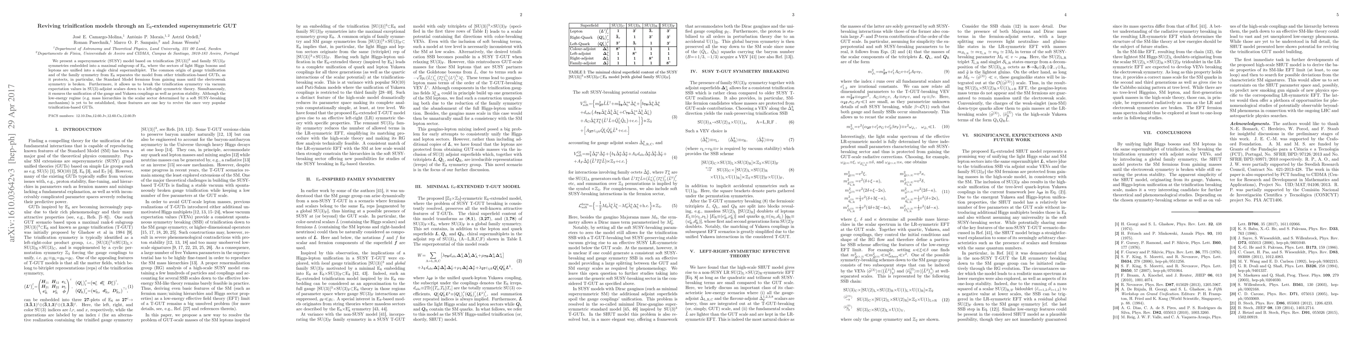 This paper proposes a supersymmetric GUT model based on trinification and family symmetry embedded in $\mathrm{E}_6$, ensuring the protection of Standard Model fermions from mass gain until electroweak symmetry breaking. It also outlines a mechanism for unifying gauge and Yukawa couplings, and maintaining proton stability, reviving interest in trinification-based GUTs.