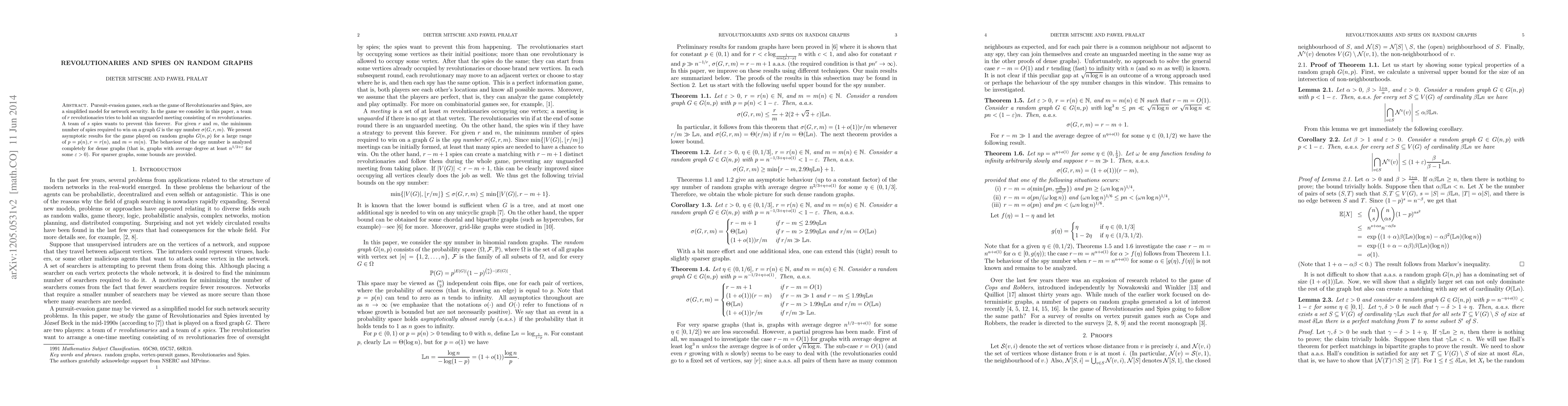 This paper investigates the pursuit-evasion game of Revolutionaries and Spies on random graphs, determining the minimum number of spies required to prevent a meeting of $m$ revolutionaries, given $r$ revolutionaries. It provides comprehensive asymptotic results for dense graphs and bounds for sparser ones.