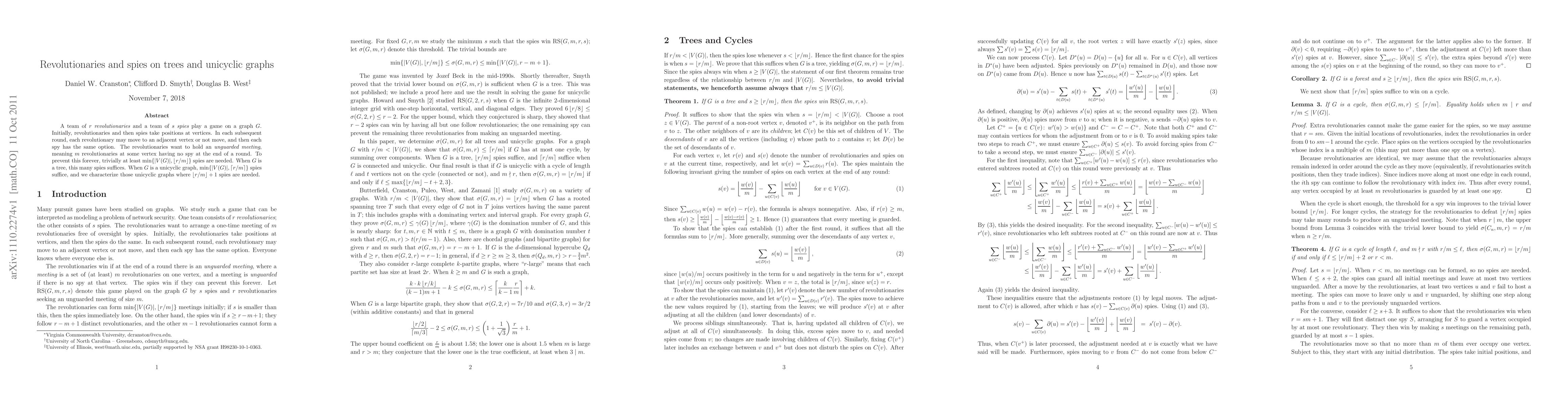 A team of revolutionaries and spies play a game on graphs where revolutionaries try to hold an unguarded meeting, while spies prevent it; the minimum number of spies needed varies between tree and unicyclic graph structures.