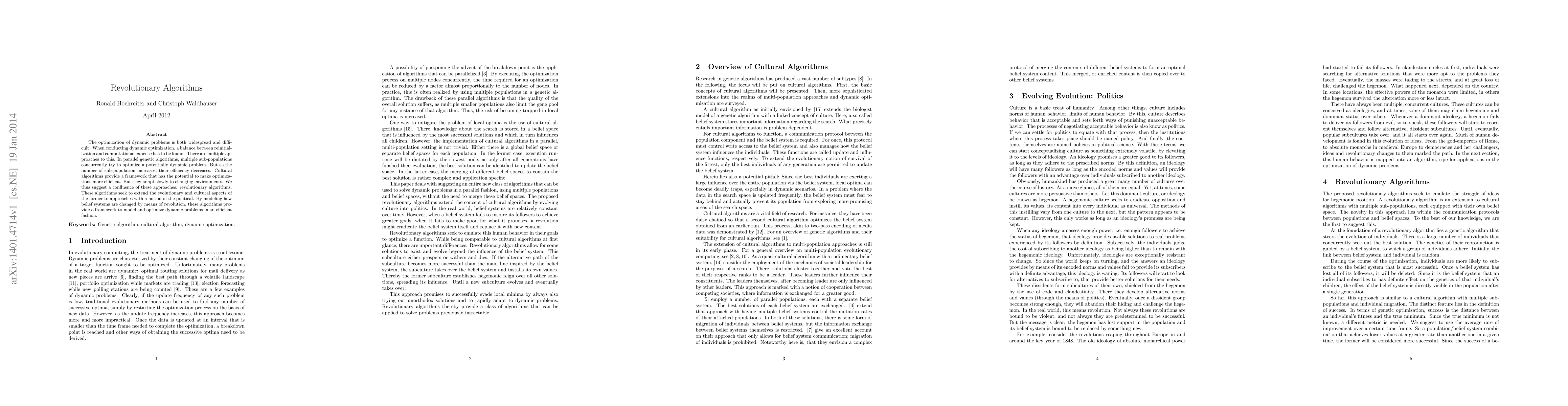 The optimization of dynamic problems is both widespread and difficult. When conducting dynamic optimization, a balance between reinitialization and computational expense has to be found. There are multiple approaches to this. In parallel genetic algorithms, multiple sub-populations concurrently try to optimize a potentially dynamic problem. But as the number of sub-population increases, their efficiency decreases. Cultural algorithms provide a framework that has the potential to make optimizations more efficient. But they adapt slowly to changing environments. We thus suggest a confluence of these approaches: revolutionary algorithms. These algorithms seek to extend the evolutionary and cultural aspects of the former to approaches with a notion of the political. By modeling how belief systems are changed by means of revolution, these algorithms provide a framework to model and optimize dynamic problems in an efficient fashion.