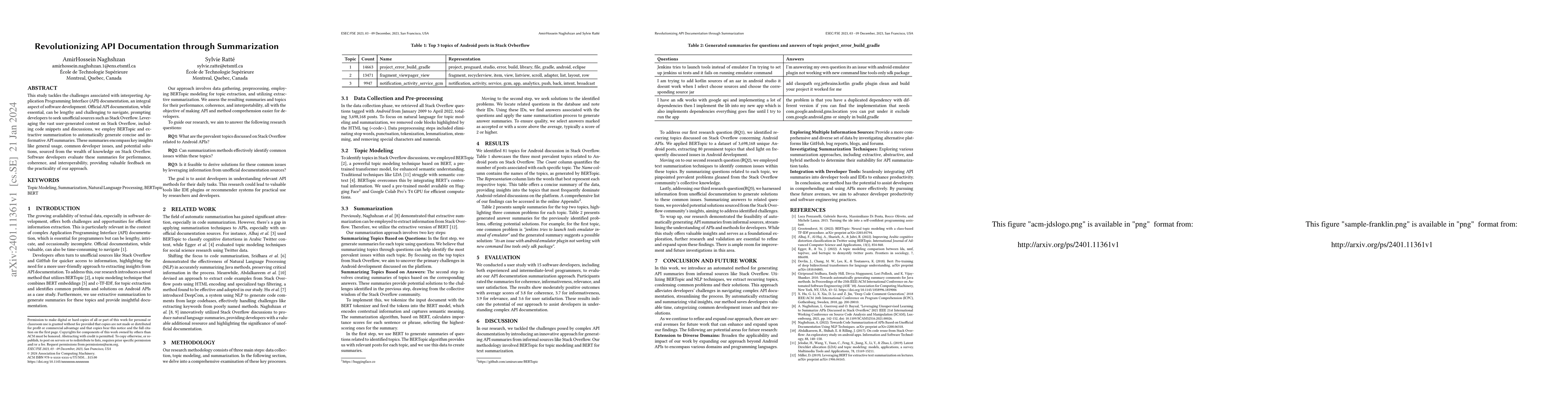 This study introduces an automated method using BERTopic and extractive summarization to generate concise API documentation summaries from Stack Overflow, aiming to improve developer navigation and understanding. Feedback from developers on the summaries' performance and coherence highlights the approach's practical benefits.