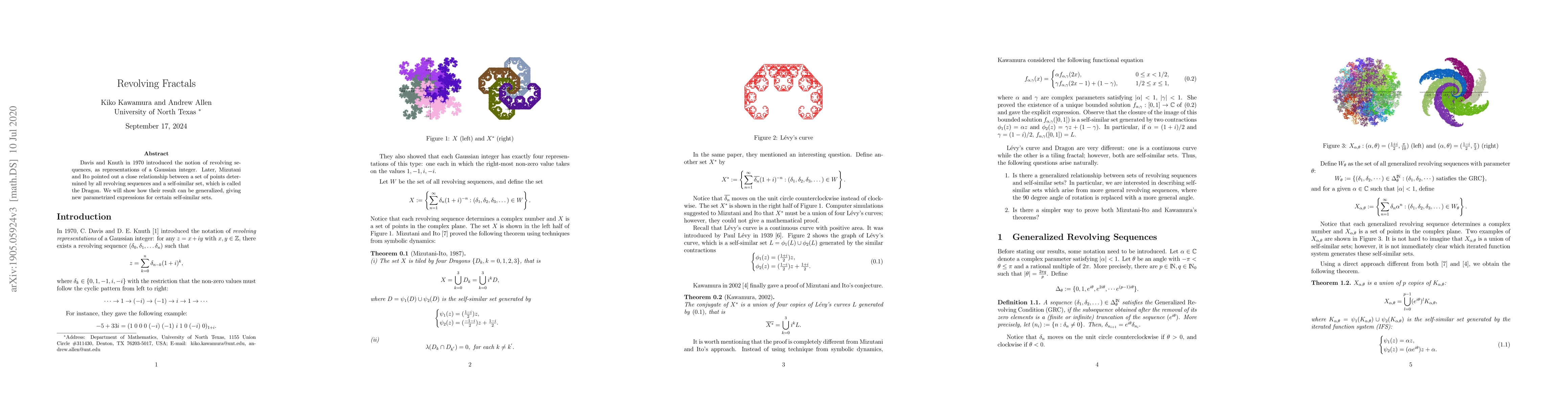 Summary: This paper generalizes the relationship between revolving sequences and self-similar sets, specifically the Dragon curve, by introducing a new parametrized expression for certain self-similar fractals. The work builds on foundational concepts introduced by Davis and Knuth in 1970 and expanded by Mizutani and Ito.