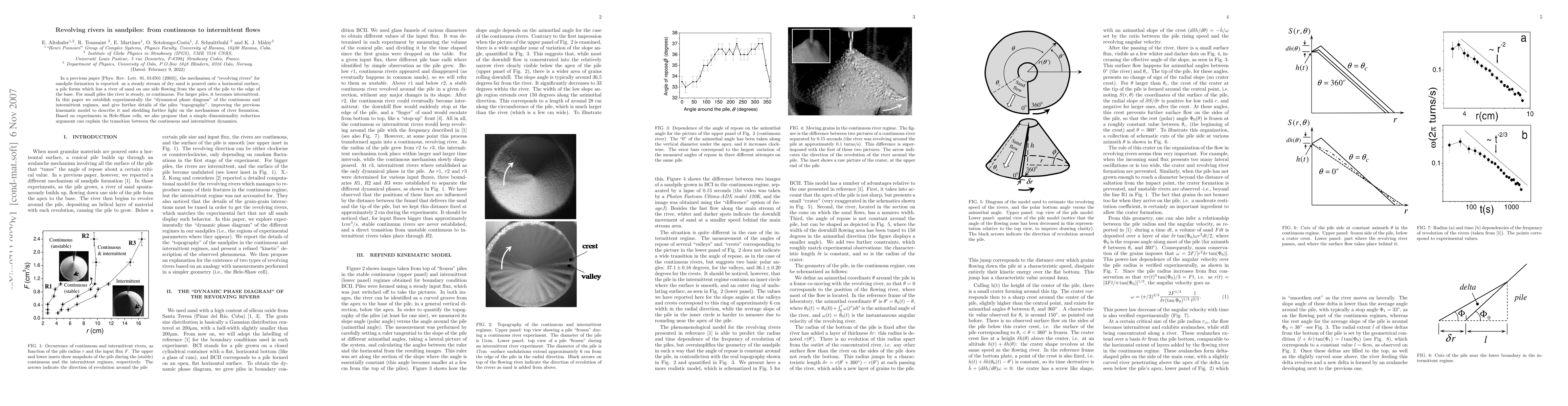 In a previous paper [Phys. Rev. Lett. 91, 014501 (2003)], the mechanism of "revolving rivers" for sandpile formation is reported: as a steady stream of dry sand is poured onto a horizontal surface, a pile forms which has a river of sand on one side owing from the apex of the pile to the edge of the base. For small piles the river is steady, or continuous. For larger piles, it becomes intermittent. In this paper we establish experimentally the "dynamical phase diagram" of the continuous and intermittent regimes, and give further details of the piles topography, improving the previous kinematic model to describe it and shedding further light on the mechanisms of river formation. Based on experiments in Hele-Shaw cells, we also propose that a simple dimensionality reduction argument can explain the transition between the continuous and intermittent dynamics.