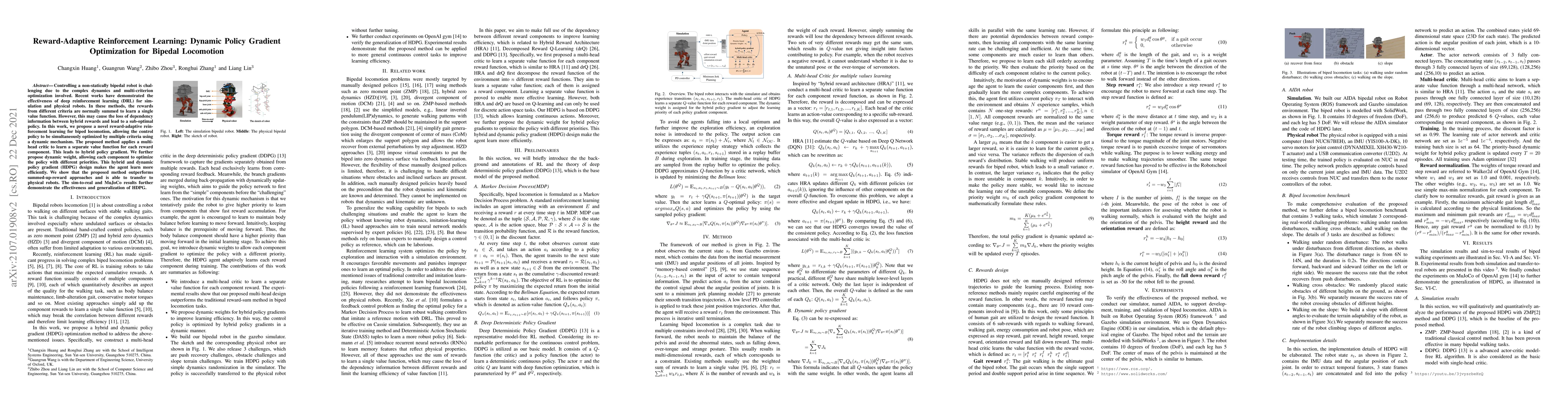 This paper proposes a reward-adaptive dynamic policy gradient method for optimizing bipedal locomotion in robots. It employs a multi-head critic to learn separate value functions for different reward components, enabling more efficient and optimal policy learning compared to traditional summed-reward approaches.