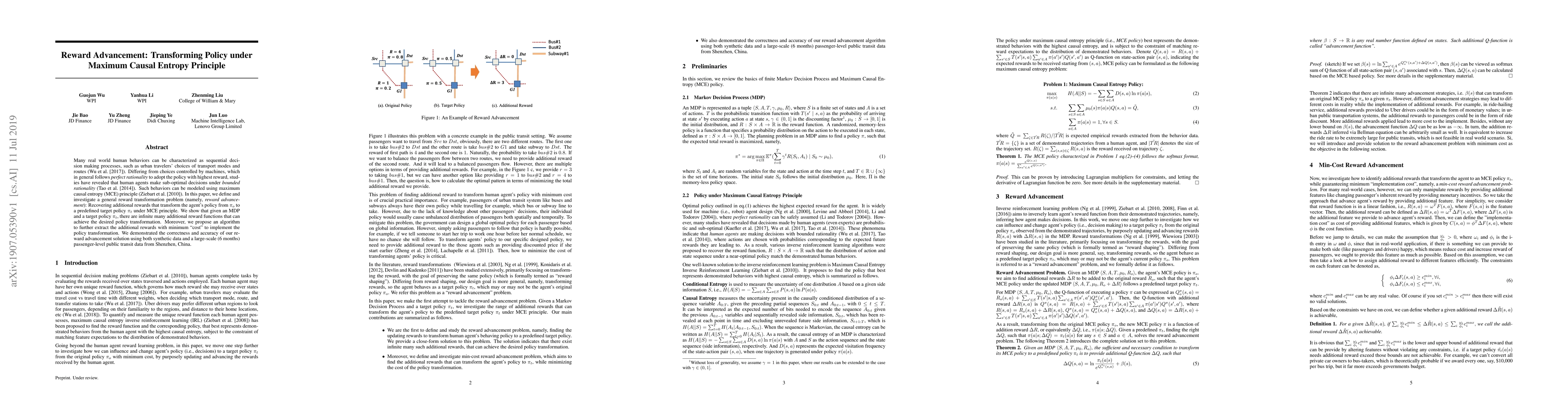 Many real-world human behaviors can be characterized as a sequential decision making processes, such as urban travelers choices of transport modes and routes (Wu et al. 2017). Differing from choices controlled by machines, which in general follows perfect rationality to adopt the policy with the highest reward, studies have revealed that human agents make sub-optimal decisions under bounded rationality (Tao, Rohde, and Corcoran 2014). Such behaviors can be modeled using maximum causal entropy (MCE) principle (Ziebart 2010). In this paper, we define and investigate a general reward trans-formation problem (namely, reward advancement): Recovering the range of additional reward functions that transform the agent's policy from original policy to a predefined target policy under MCE principle. We show that given an MDP and a target policy, there are infinite many additional reward functions that can achieve the desired policy transformation. Moreover, we propose an algorithm to further extract the additional rewards with minimum "cost" to implement the policy transformation.