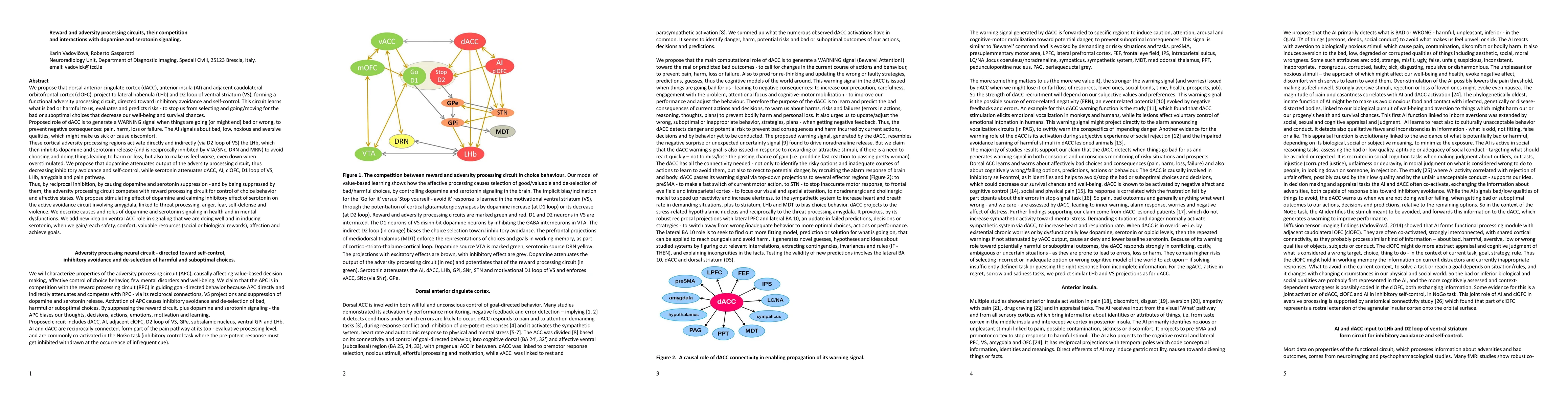 We propose that dACC, AI and caudolateral OFC(clOFC) project to lateral habenula (LHb) and D2 loop of ventral striatum (VS), forming a functional adversity processing circuit, directed towards inhibitory avoidance and self-control. This circuit learns what is bad or harmful to us and predicts risks, to stop us from going/moving for bad or suboptimal choices that decrease our well-being and survival chances. Proposed dACC role is to generate a WARNING signal when things are going (or might end) bad or wrong to prevent negative consequences: pain, harm, loss or failure. The AI signals about bad low aversive qualities, which make us sick or cause discomfort. These cortical inputs activate directly and indirectly (via D2 loop of VS) the LHb, which inhibits dopamine and serotonin release (and is reciprocally inhibited by VTA, DRN) to avoid choosing and doing things leading to harm or loss, but also to make us feel worse, down when overstimulated. We propose that dopamine attenuates the output of the adversity processing circuit, thus decreasing inhibitory avoidance and self-control, while serotonin attenuates dACC, AI, clOFC, D1 loop of VS, LHb, amygdala and pain pathway. Thus, by reciprocal inhibition, by causing dopamine and serotonin suppression - and by being suppressed by them, the adversity processing circuit competes with reward processing circuit for control of choice behaviour and affective states. We propose stimulating effect of dopamine and calming inhibitory effect of serotonin on the active avoidance circuit involving amygdala, linked to threat processing, anger, fear, self-defense and violences. We describe causes and roles of dopamine and serotonin signaling, and mental dysfunctions. We add new idea on vACC role in signaling that we are doing well and in inducing serotonin, when we gain/reach safety, comfort, valuable resources, social/biological rewards, affection or goals.