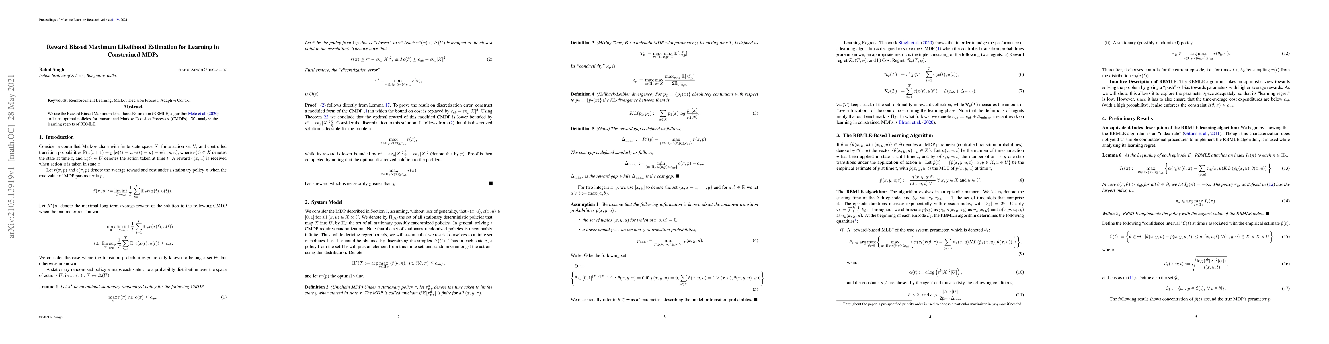 Summary: This paper introduces the Reward Biased Maximum Likelihood Estimation (RBMLE) algorithm for learning optimal policies in constrained Markov Decision Processes (CMDPs) and analyzes its learning regret properties. The focus is on understanding the algorithm's performance under constraints.