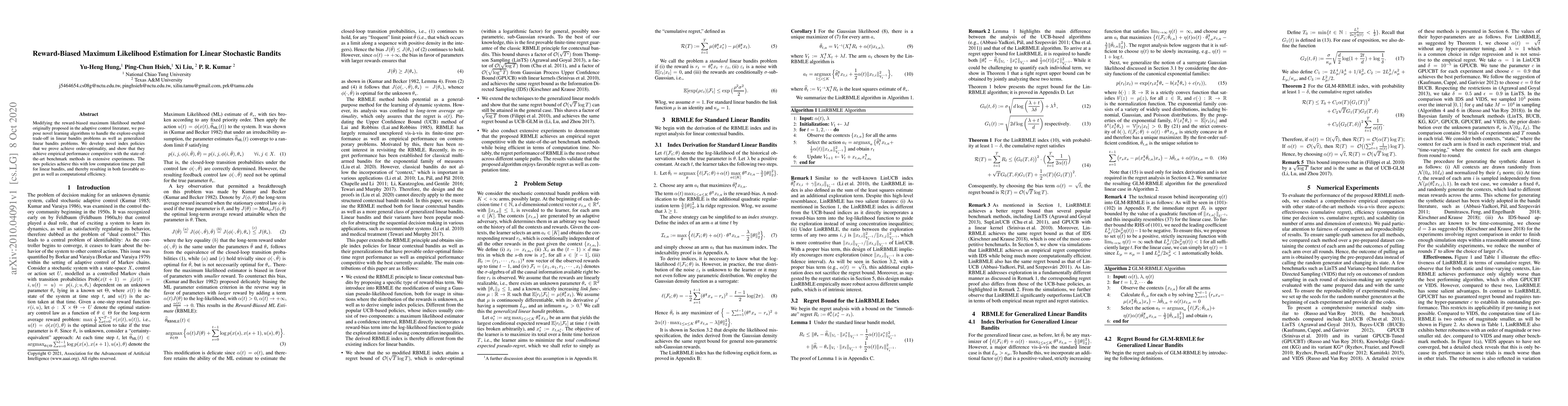 Modifying the reward-biased maximum likelihood method originally proposed in the adaptive control literature, we propose novel learning algorithms to handle the explore-exploit trade-off in linear bandits problems as well as generalized linear bandits problems. We develop novel index policies that we prove achieve order-optimality, and show that they achieve empirical performance competitive with the state-of-the-art benchmark methods in extensive experiments. The new policies achieve this with low computation time per pull for linear bandits, and thereby resulting in both favorable regret as well as computational efficiency.