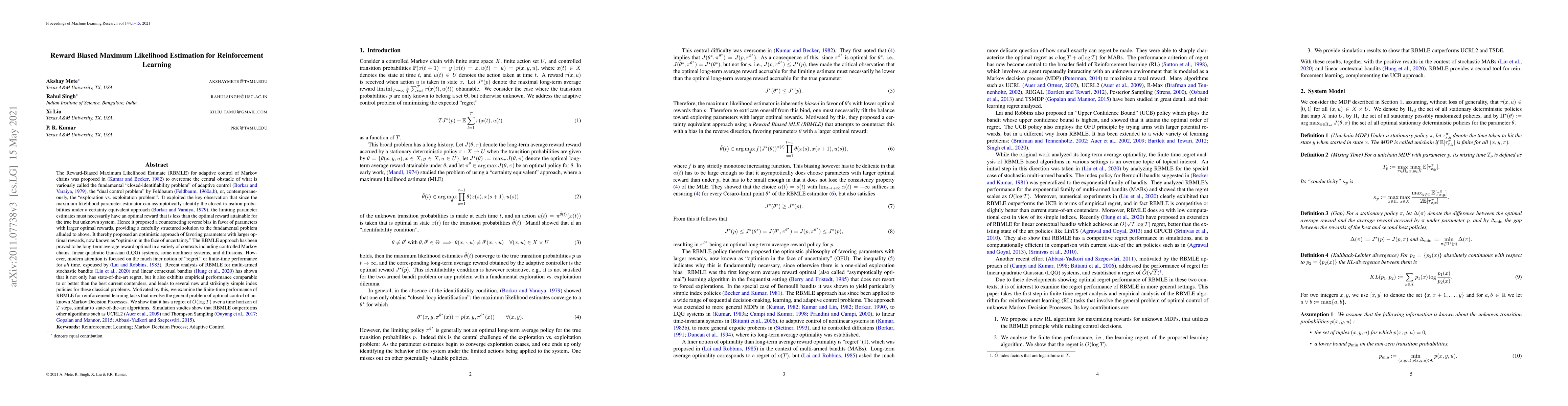 The Reward-Biased Maximum Likelihood Estimate (RBMLE) addresses the exploration vs. exploitation problem in reinforcement learning by favoring parameters with higher optimal rewards, achieving state-of-the-art regret performance and outperforming algorithms like UCRL2 and Thompson Sampling in simulations.