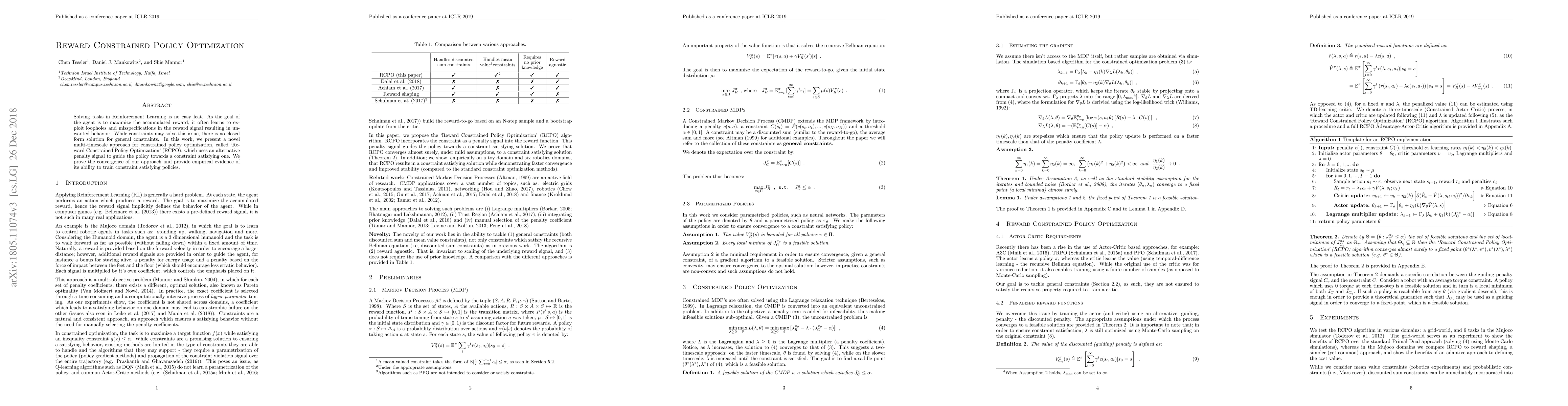 Solving tasks in Reinforcement Learning is no easy feat. As the goal of the agent is to maximize the accumulated reward, it often learns to exploit loopholes and misspecifications in the reward signal resulting in unwanted behavior. While constraints may solve this issue, there is no closed form solution for general constraints. In this work we present a novel multi-timescale approach for constrained policy optimization, called `Reward Constrained Policy Optimization' (RCPO), which uses an alternative penalty signal to guide the policy towards a constraint satisfying one. We prove the convergence of our approach and provide empirical evidence of its ability to train constraint satisfying policies.