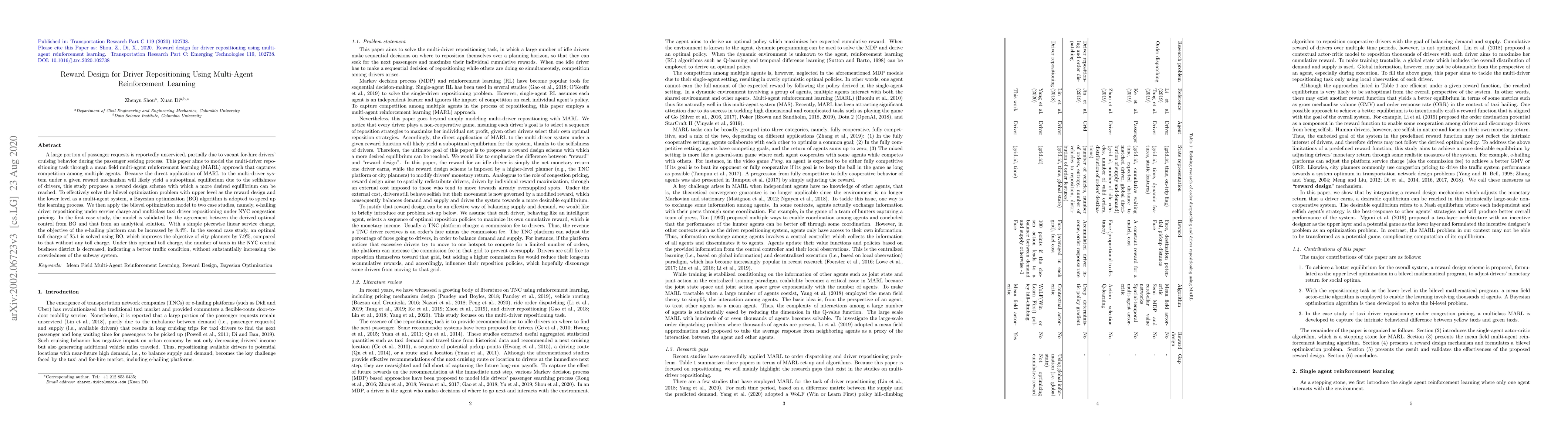 A large portion of passenger requests is reportedly unserviced, partially due to vacant for-hire drivers' cruising behavior during the passenger seeking process. This paper aims to model the multi-driver repositioning task through a mean field multi-agent reinforcement learning (MARL) approach that captures competition among multiple agents. Because the direct application of MARL to the multi-driver system under a given reward mechanism will likely yield a suboptimal equilibrium due to the selfishness of drivers, this study proposes a reward design scheme with which a more desired equilibrium can be reached. To effectively solve the bilevel optimization problem with upper level as the reward design and the lower level as a multi-agent system, a Bayesian optimization (BO) algorithm is adopted to speed up the learning process. We then apply the bilevel optimization model to two case studies, namely, e-hailing driver repositioning under service charge and multiclass taxi driver repositioning under NYC congestion pricing. In the first case study, the model is validated by the agreement between the derived optimal control from BO and that from an analytical solution. With a simple piecewise linear service charge, the objective of the e-hailing platform can be increased by 8.4%. In the second case study, an optimal toll charge of $5.1 is solved using BO, which improves the objective of city planners by 7.9%, compared to that without any toll charge. Under this optimal toll charge, the number of taxis in the NYC central business district is decreased, indicating a better traffic condition, without substantially increasing the crowdedness of the subway system.