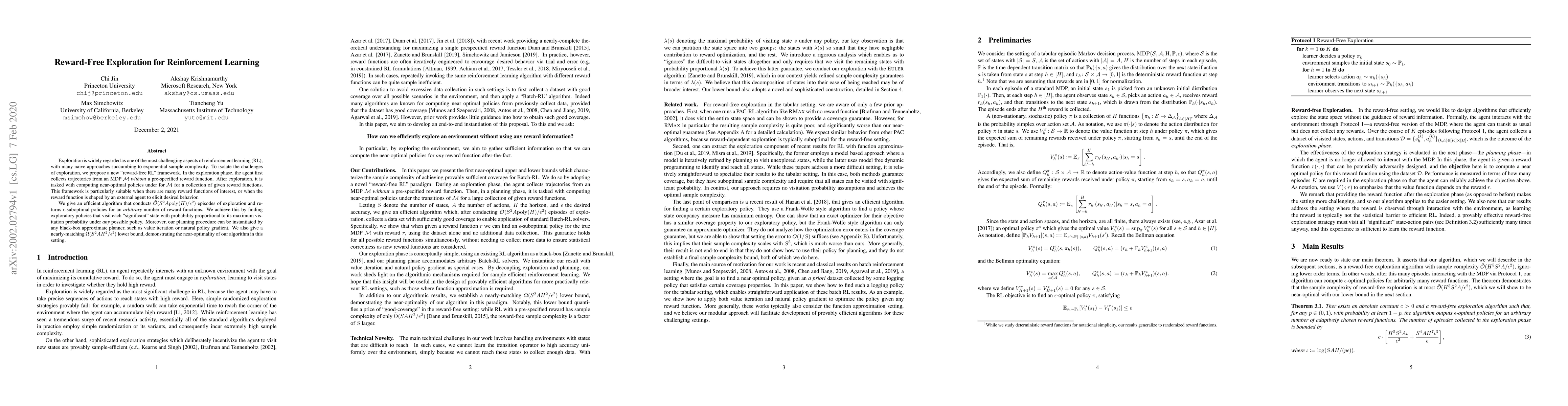 This paper proposes a "reward-free RL" framework to tackle the challenge of exploration in reinforcement learning without a predefined reward function. It introduces an efficient algorithm that explores an MDP to find near-optimal policies for multiple reward functions, achieving near-optimality with a lower bound.