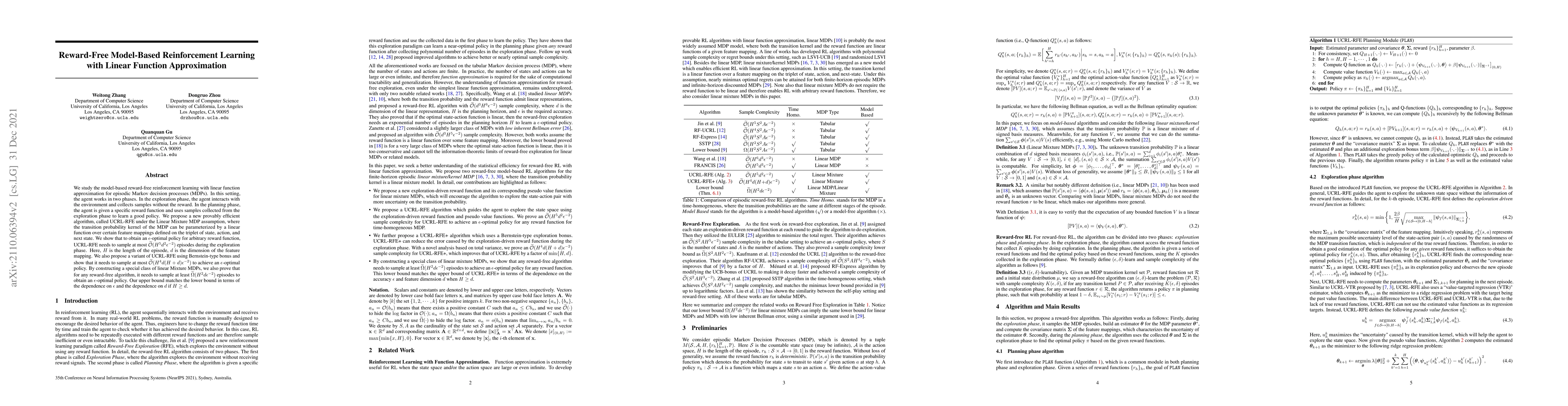 We study the model-based reward-free reinforcement learning with linear function approximation for episodic Markov decision processes (MDPs). In this setting, the agent works in two phases. In the exploration phase, the agent interacts with the environment and collects samples without the reward. In the planning phase, the agent is given a specific reward function and uses samples collected from the exploration phase to learn a good policy. We propose a new provably efficient algorithm, called UCRL-RFE under the Linear Mixture MDP assumption, where the transition probability kernel of the MDP can be parameterized by a linear function over certain feature mappings defined on the triplet of state, action, and next state. We show that to obtain an $\epsilon$-optimal policy for arbitrary reward function, UCRL-RFE needs to sample at most $\tilde{\mathcal{O}}(H^5d^2\epsilon^{-2})$ episodes during the exploration phase. Here, $H$ is the length of the episode, $d$ is the dimension of the feature mapping. We also propose a variant of UCRL-RFE using Bernstein-type bonus and show that it needs to sample at most $\tilde{\mathcal{O}}(H^4d(H + d)\epsilon^{-2})$ to achieve an $\epsilon$-optimal policy. By constructing a special class of linear Mixture MDPs, we also prove that for any reward-free algorithm, it needs to sample at least $\tilde \Omega(H^2d\epsilon^{-2})$ episodes to obtain an $\epsilon$-optimal policy. Our upper bound matches the lower bound in terms of the dependence on $\epsilon$ and the dependence on $d$ if $H \ge d$.