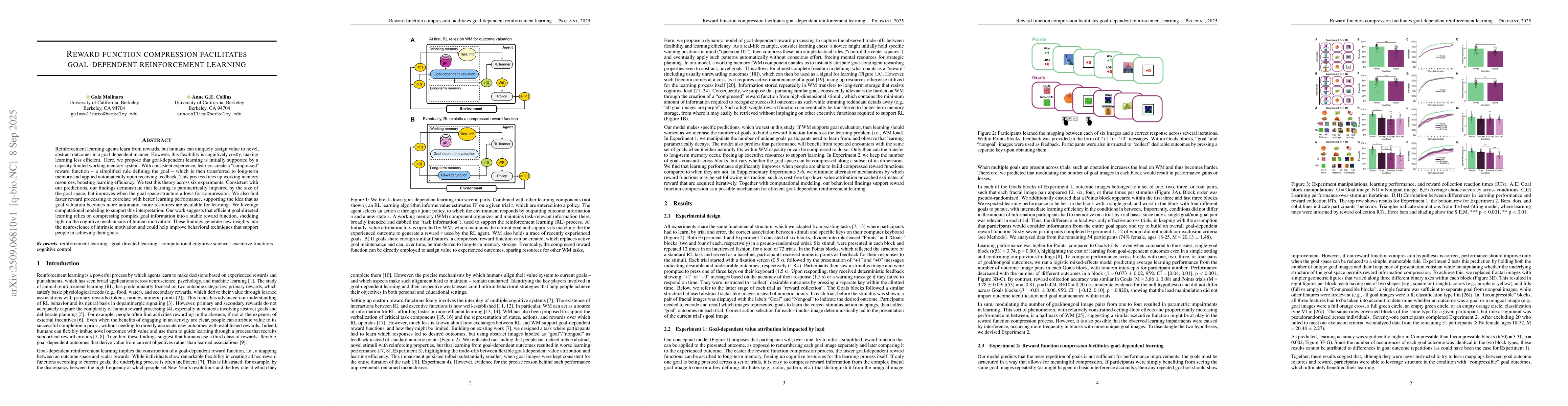 Reinforcement learning agents learn from rewards, but humans can uniquely assign value to novel, abstract outcomes in a goal-dependent manner. However, this flexibility is cognitively costly, making learning less efficient. Here, we propose that goal-dependent learning is initially supported by a capacity-limited working memory system. With consistent experience, learners create a "compressed" reward function (a simplified rule defining the goal) which is then transferred to long-term memory and applied automatically upon receiving feedback. This process frees up working memory resources, boosting learning efficiency. We test this theory across six experiments. Consistent with our predictions, our findings demonstrate that learning is parametrically impaired by the size of the goal space, but improves when the goal space structure allows for compression. We also find faster reward processing to correlate with better learning performance, supporting the idea that as goal valuation becomes more automatic, more resources are available for learning. We leverage computational modeling to support this interpretation. Our work suggests that efficient goal-directed learning relies on compressing complex goal information into a stable reward function, shedding light on the cognitive mechanisms of human motivation. These findings generate new insights into the neuroscience of intrinsic motivation and could help improve behavioral techniques that support people in achieving their goals.