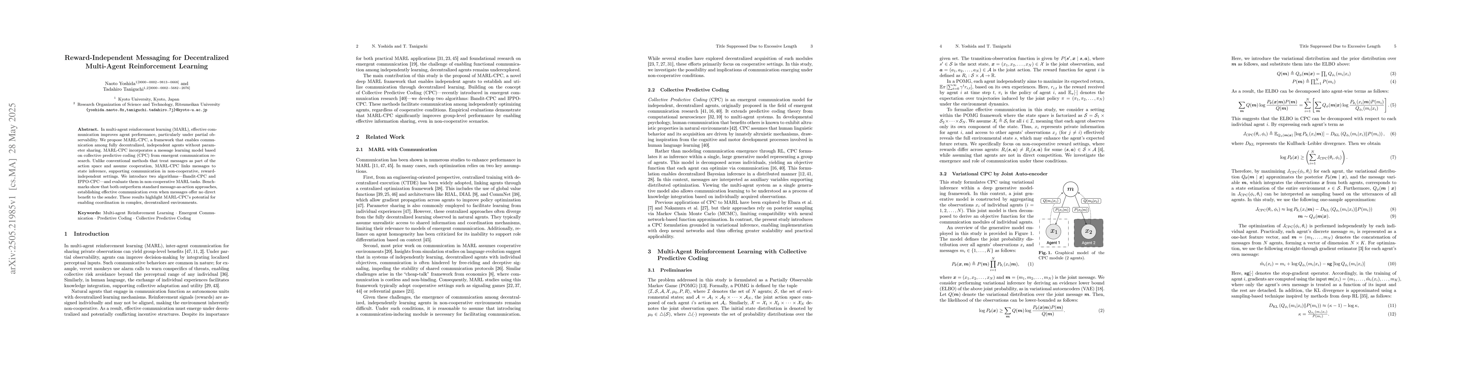 In multi-agent reinforcement learning (MARL), effective communication improves agent performance, particularly under partial observability. We propose MARL-CPC, a framework that enables communication among fully decentralized, independent agents without parameter sharing. MARL-CPC incorporates a message learning model based on collective predictive coding (CPC) from emergent communication research. Unlike conventional methods that treat messages as part of the action space and assume cooperation, MARL-CPC links messages to state inference, supporting communication in non-cooperative, reward-independent settings. We introduce two algorithms -Bandit-CPC and IPPO-CPC- and evaluate them in non-cooperative MARL tasks. Benchmarks show that both outperform standard message-as-action approaches, establishing effective communication even when messages offer no direct benefit to the sender. These results highlight MARL-CPC's potential for enabling coordination in complex, decentralized environments.