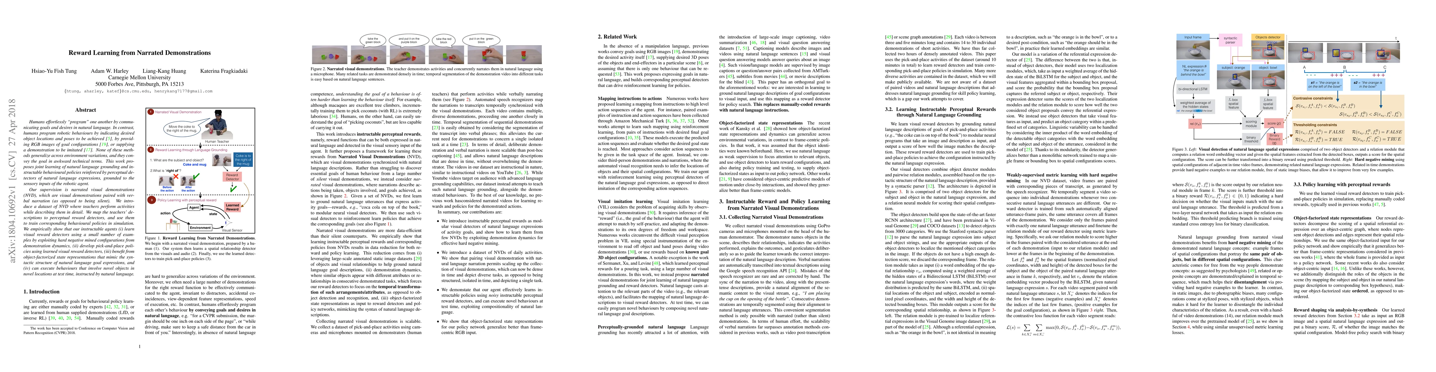 Humans effortlessly "program" one another by communicating goals and desires in natural language. In contrast, humans program robotic behaviours by indicating desired object locations and poses to be achieved, by providing RGB images of goal configurations, or supplying a demonstration to be imitated. None of these methods generalize across environment variations, and they convey the goal in awkward technical terms. This work proposes joint learning of natural language grounding and instructable behavioural policies reinforced by perceptual detectors of natural language expressions, grounded to the sensory inputs of the robotic agent. Our supervision is narrated visual demonstrations(NVD), which are visual demonstrations paired with verbal narration (as opposed to being silent). We introduce a dataset of NVD where teachers perform activities while describing them in detail. We map the teachers' descriptions to perceptual reward detectors, and use them to train corresponding behavioural policies in simulation.We empirically show that our instructable agents (i) learn visual reward detectors using a small number of examples by exploiting hard negative mined configurations from demonstration dynamics, (ii) develop pick-and place policies using learned visual reward detectors, (iii) benefit from object-factorized state representations that mimic the syntactic structure of natural language goal expressions, and (iv) can execute behaviours that involve novel objects in novel locations at test time, instructed by natural language.