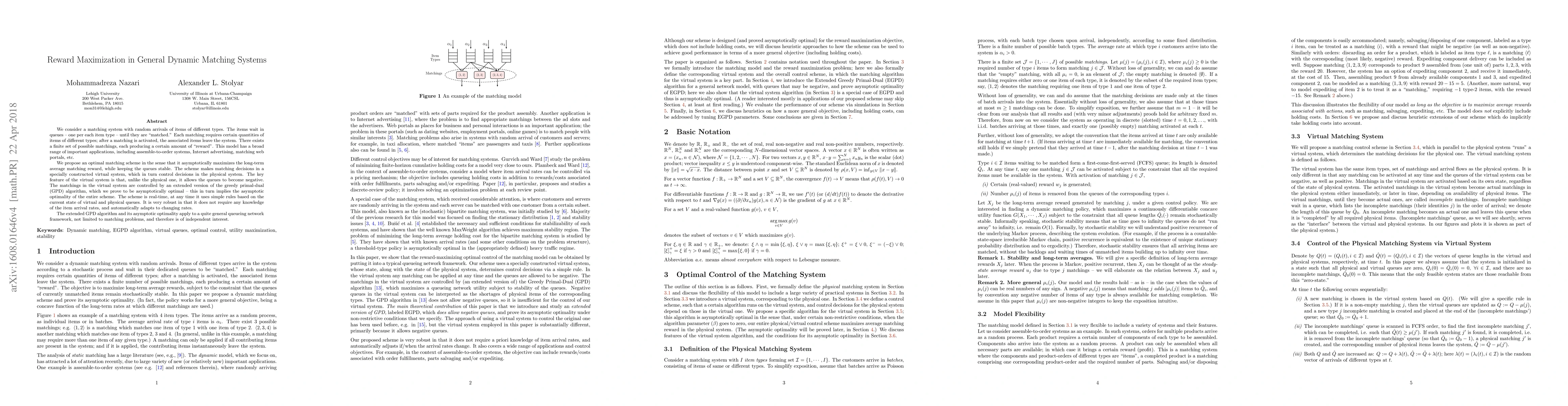 This research paper proposes an optimal matching scheme for a dynamic system that maximizes long-term average reward while keeping queues stable, using a virtual system controlled by an extended greedy primal-dual algorithm.