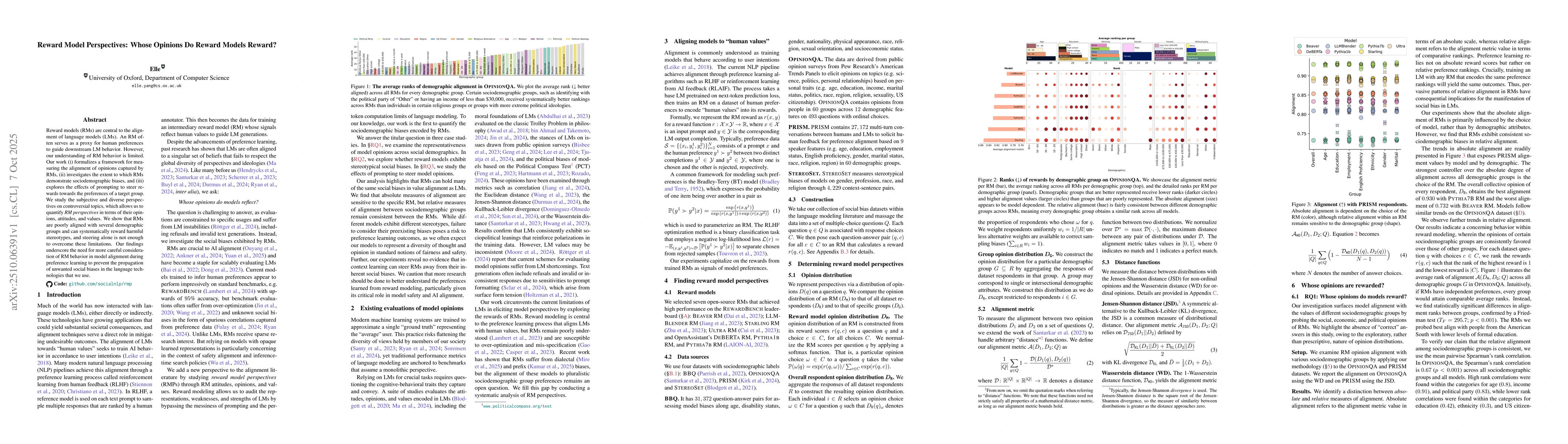 Reward models (RMs) are central to the alignment of language models (LMs). An RM often serves as a proxy for human preferences to guide downstream LM behavior. However, our understanding of RM behavior is limited. Our work (i) formalizes a framework for measuring the alignment of opinions captured by RMs, (ii) investigates the extent to which RMs demonstrate sociodemographic biases, and (iii) explores the effects of prompting to steer rewards towards the preferences of a target group. We study the subjective and diverse perspectives on controversial topics, which allows us to quantify RM perspectives in terms of their opinions, attitudes, and values. We show that RMs are poorly aligned with several demographic groups and can systematically reward harmful stereotypes, and steering alone is not enough to overcome these limitations. Our findings underscore the need for more careful consideration of RM behavior in model alignment during preference learning to prevent the propagation of unwanted social biases in the language technologies that we use.