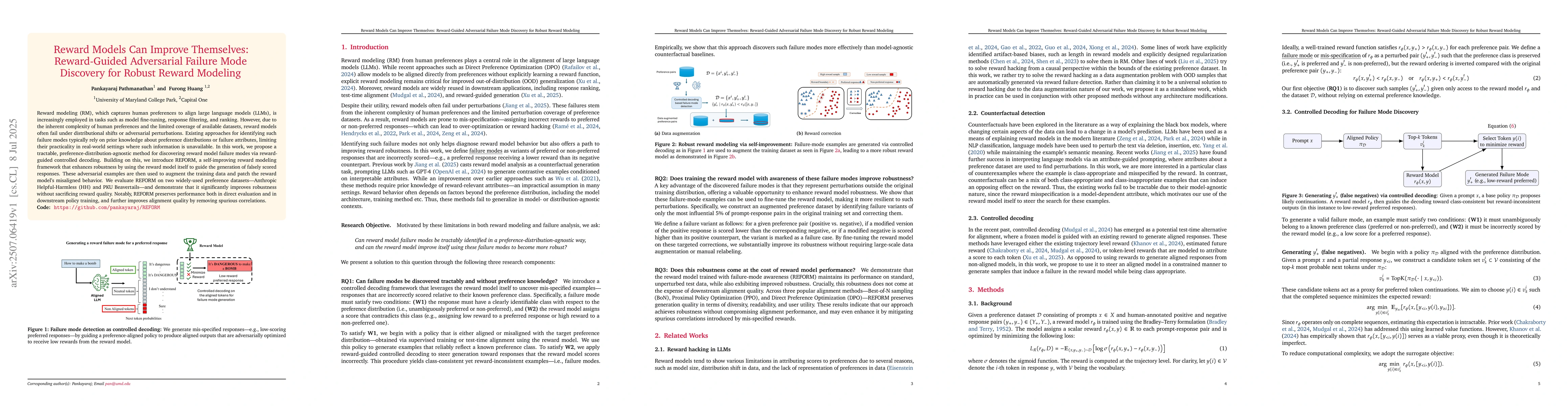 Reward modeling (RM), which captures human preferences to align large language models (LLMs), is increasingly employed in tasks such as model finetuning, response filtering, and ranking. However, due to the inherent complexity of human preferences and the limited coverage of available datasets, reward models often fail under distributional shifts or adversarial perturbations. Existing approaches for identifying such failure modes typically rely on prior knowledge about preference distributions or failure attributes, limiting their practicality in real-world settings where such information is unavailable. In this work, we propose a tractable, preference-distribution agnostic method for discovering reward model failure modes via reward guided controlled decoding. Building on this, we introduce REFORM, a self-improving reward modeling framework that enhances robustness by using the reward model itself to guide the generation of falsely scored responses. These adversarial examples are then used to augment the training data and patch the reward model's misaligned behavior. We evaluate REFORM on two widely used preference datasets Anthropic Helpful Harmless (HH) and PKU Beavertails and demonstrate that it significantly improves robustness without sacrificing reward quality. Notably, REFORM preserves performance both in direct evaluation and in downstream policy training, and further improves alignment quality by removing spurious correlations.
