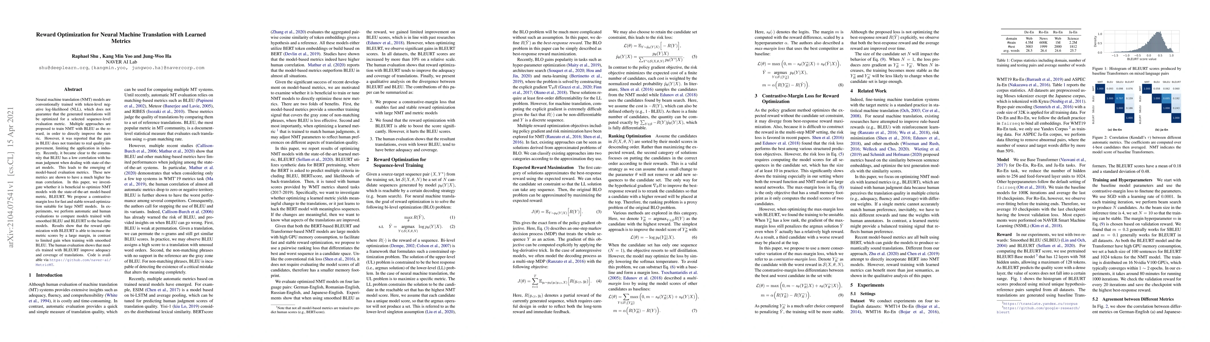 Neural machine translation (NMT) models are conventionally trained with token-level negative log-likelihood (NLL), which does not guarantee that the generated translations will be optimized for a selected sequence-level evaluation metric. Multiple approaches are proposed to train NMT with BLEU as the reward, in order to directly improve the metric. However, it was reported that the gain in BLEU does not translate to real quality improvement, limiting the application in industry. Recently, it became clear to the community that BLEU has a low correlation with human judgment when dealing with state-of-the-art models. This leads to the emerging of model-based evaluation metrics. These new metrics are shown to have a much higher human correlation. In this paper, we investigate whether it is beneficial to optimize NMT models with the state-of-the-art model-based metric, BLEURT. We propose a contrastive-margin loss for fast and stable reward optimization suitable for large NMT models. In experiments, we perform automatic and human evaluations to compare models trained with smoothed BLEU and BLEURT to the baseline models. Results show that the reward optimization with BLEURT is able to increase the metric scores by a large margin, in contrast to limited gain when training with smoothed BLEU. The human evaluation shows that models trained with BLEURT improve adequacy and coverage of translations. Code is available via https://github.com/naver-ai/MetricMT.