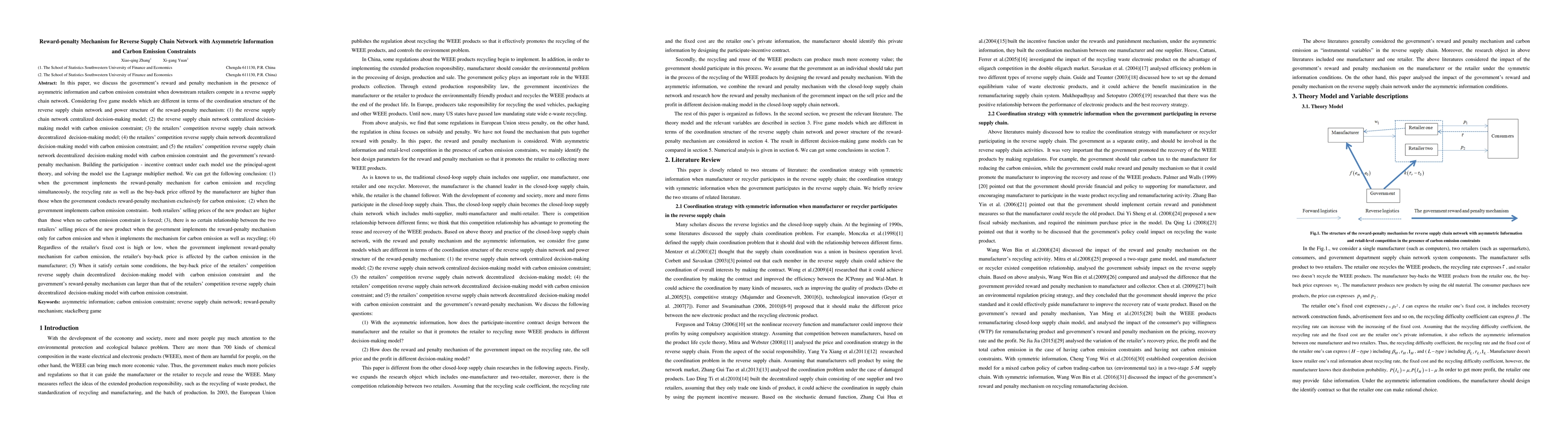 This paper explores government reward-penalty mechanisms in reverse supply chain networks under asymmetric information and carbon emission constraints, analyzing five game models. It concludes that a combined reward-penalty mechanism for carbon emission and recycling boosts recycling rates and buy-back prices, while carbon emission constraints increase new product selling prices. The relationship between selling prices under different reward-penalty implementations is inconclusive.