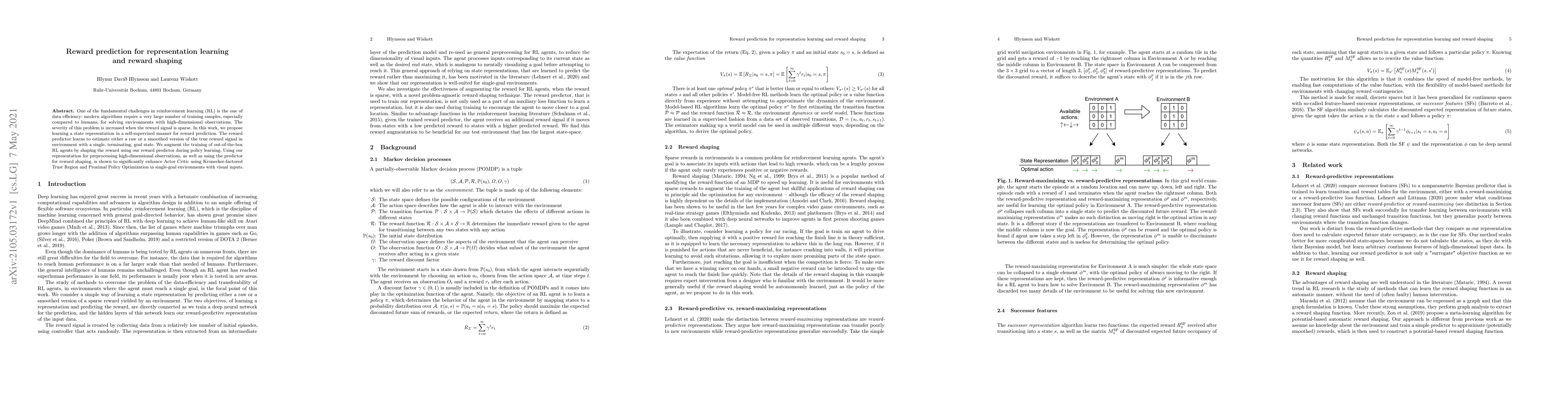 This paper proposes a self-supervised method to learn a state representation for reward prediction, aiming to improve data efficiency in reinforcement learning. By shaping the reward using the learned predictor, it significantly enhances the performance of Actor-Critic algorithms in environments with high-dimensional visual inputs and sparse rewards.