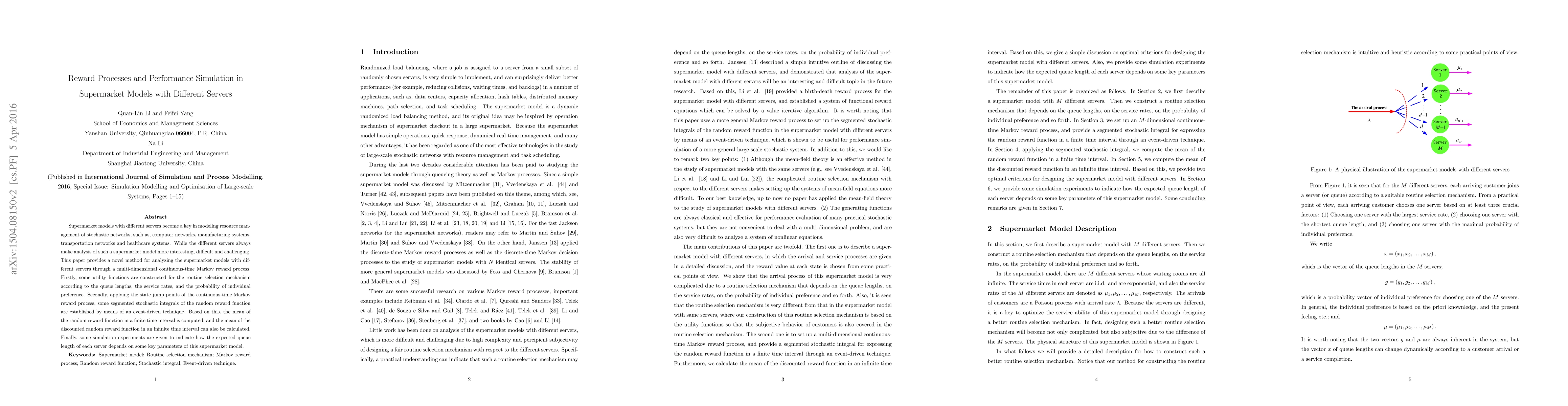 Supermarket models with different servers become a key in modeling resource management of stochastic networks, such as, computer networks, manufacturing systems and transportation networks. While these different servers always make analysis of such a supermarket model more interesting, difficult and challenging. This paper provides a new novel method for analyzing the supermarket model with different servers through a multi-dimensional continuous-time Markov reward processes. Firstly, the utility functions are constructed for expressing a routine selection mechanism that depends on queue lengths, on service rates, and on some probabilities of individual preference. Then applying the continuous-time Markov reward processes, some segmented stochastic integrals of the random reward function are established by means of an event-driven technique. Based on this, the mean of the random reward function in a finite time period is effectively computed by means of the state jump points of the Markov reward process, and also the mean of the discounted random reward function in an infinite time period can be calculated through the same event-driven technique. Finally, some simulation experiments are given to indicate how the expected queue length of each server depends on the main parameters of this supermarket model.
