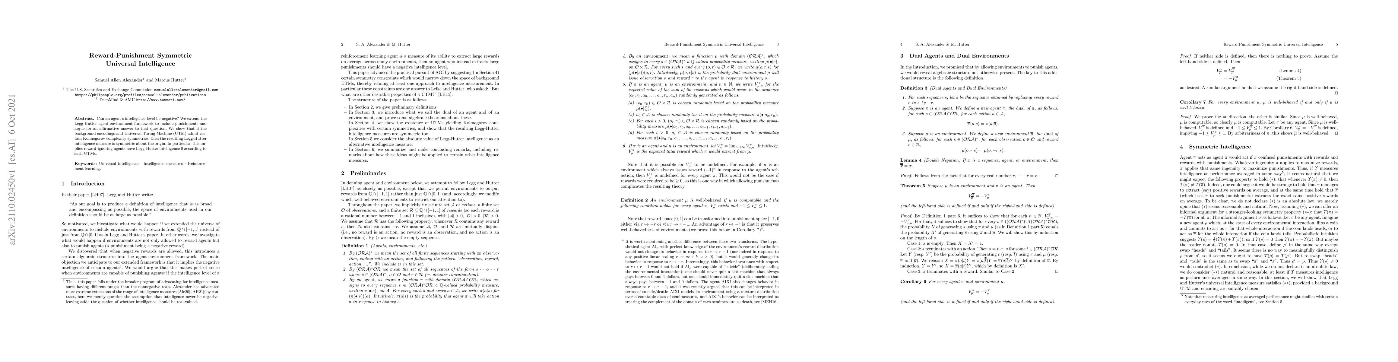 Can an agent's intelligence level be negative? We extend the Legg-Hutter agent-environment framework to include punishments and argue for an affirmative answer to that question. We show that if the background encodings and Universal Turing Machine (UTM) admit certain Kolmogorov complexity symmetries, then the resulting Legg-Hutter intelligence measure is symmetric about the origin. In particular, this implies reward-ignoring agents have Legg-Hutter intelligence 0 according to such UTMs.
