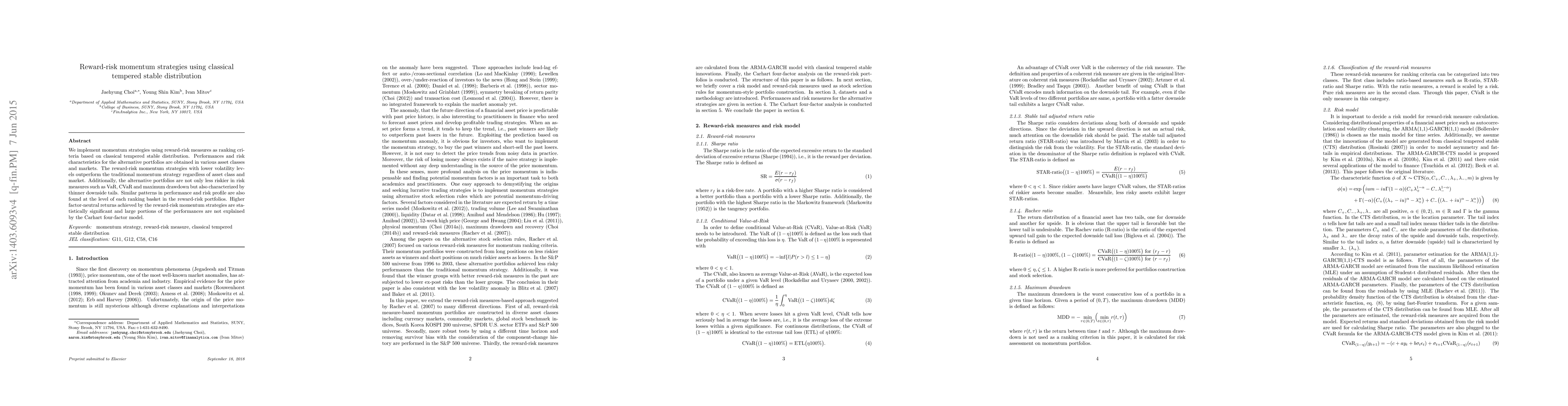 We implement momentum strategies using reward-risk measures as ranking criteria based on classical tempered stable distribution. Performances and risk characteristics for the alternative portfolios are obtained in various asset classes and markets. The reward-risk momentum strategies with lower volatility levels outperform the traditional momentum strategy regardless of asset class and market. Additionally, the alternative portfolios are not only less riskier in risk measures such as VaR, CVaR and maximum drawdown but also characterized by thinner downside tails. Similar patterns in performance and risk profile are also found at the level of each ranking basket in the reward-risk portfolios. Higher factor-neutral returns achieved by the reward-risk momentum strategies are statistically significant and large portions of the performances are not explained by the Carhart four-factor model.
