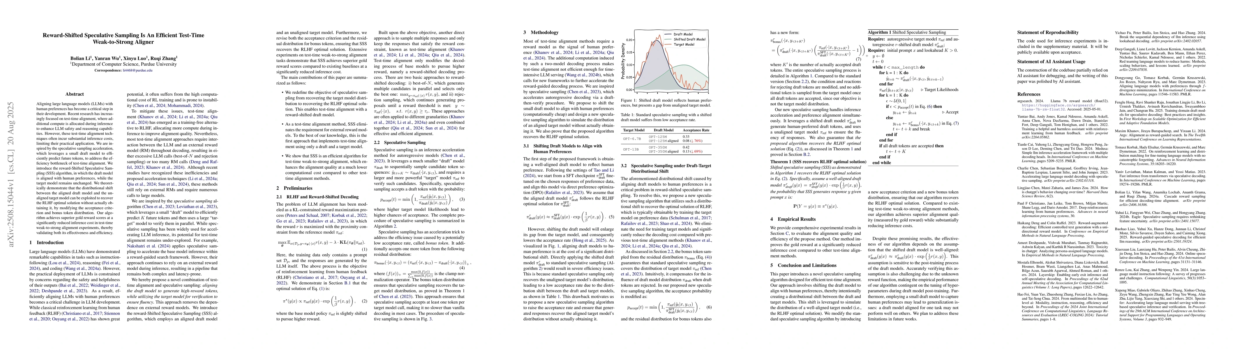 The paper introduces Reward-Shifted Speculative Sampling (SSS), an efficient test-time weak-to-strong alignment algorithm for large language models (LLMs). It leverages a small draft model aligned with human preferences and an unchanged target model, modifying the standard speculative sampling algorithm with a new acceptance criterion and bonus token distribution.